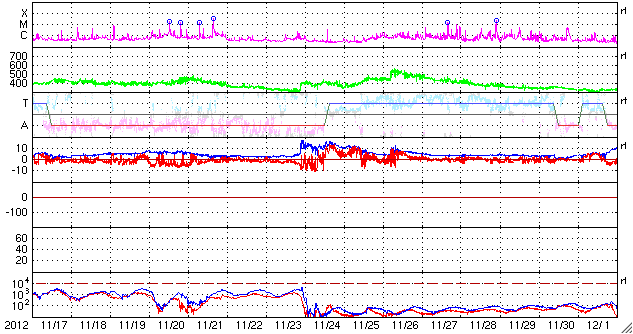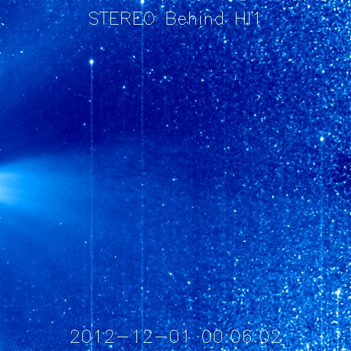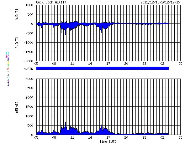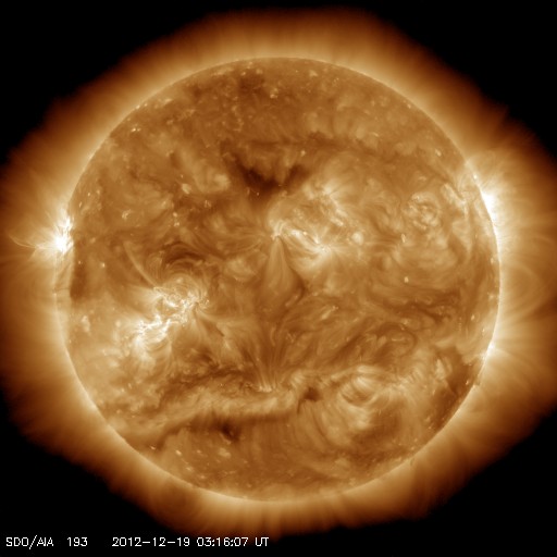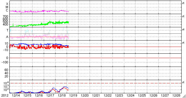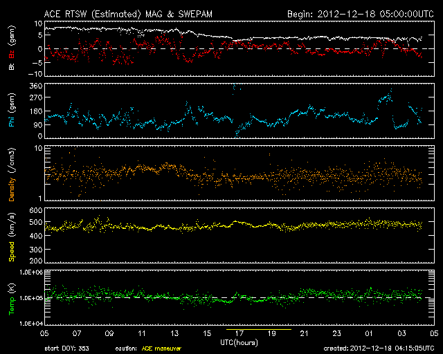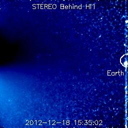 2012/12/19 13:15 更新 太陽風はやや高速の状態が続いています。STEREO BehindのHi1に地球が見えています。 担当 篠原 太陽風の速度は、480〜500km/秒に高まった状態が続いています。 一方、磁場強度は8nTから4nTと平均的な値に下がりました。 太陽風の弱い高まりは終わりに近づいていると思われます。 SDO衛星AIA193の太陽コロナ写真を見ると、 南半球のコロナホールはもう西の端に遠ざかっています。 太陽風の変化がこの領域と関係しているのであれば、 そろそろ終わっても良さそうです。 磁気圏では、AE指数の前半で弱い活動が発生しています。 太陽風の磁場がまだ強めだった頃に、 南向きに振れたときに発生している変化です。 磁場強度が弱まってきてからは、南にも大きく振れなくなり、 磁気圏も静かになっています。 太陽では、東の端から新しい黒点群が姿を現しました。 1635黒点群と番号が付けられています。 姿を現してからは、特に目立った活動は起こしていません。 今後どの様な動きを見せるでしょうか。 昨日、TwitterでSTEREO Behind衛星のHi1カメラに 地球が入っていることを教えていただきました(ありがとうございます!)。 写真の右端に少しだけ顔を出しています。 いつから見えていたのかとさかのぼってみると、 今月の初めの頃から、ちらちらと明るい姿を現していた様です。 (写り方が少し変な気もしますが、11月にはこの光は見えていません) STEREO衛星もいよいよ太陽の向こう側に回ったのだなと実感します。 ![]() STEREO Behind衛星のHI1カメラの右端に地球が見えてきました。 (c) STEREO (NASA)、 (動画加工 : 宇宙天気ニュース) ![]() STEREO Behind衛星のHi1カメラに見えた地球。 (c) STEREO (NASA) ![]() 現在のSTEREO衛星の位置。 (c) STEREO (NASA) ![]() SDO衛星のAIA193カメラによる太陽コロナの様子 (c) SDO (NASA) ![]() SDO衛星による太陽の可視光写真。マウスの矢印を写真に重ねると、黒点番号付きの写真に切り替わります。 (c) SDO (NASA) ![]() ACEが観測した太陽風の磁場(1番上の枠、白線は全体の強度、赤線は南北成分) および、太陽風の密度(3番目の橙線)、速度(4番目の黄線) (c) NOAA/SWPC ![]() リアルタイムAE指数 下段のAEグラフの値が高くなると、オーロラ活動が活発化しています。 (c) 京都大学, NICT ![]() 27日の太陽周期に合わせたデータプロット 太陽が同じ面を地球に向けていた27日前の変化から、今後を予想することができます。 (c) 作図:宇宙天気ニュース
