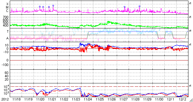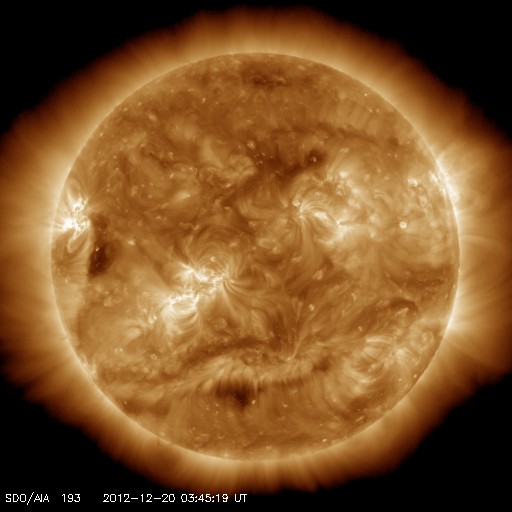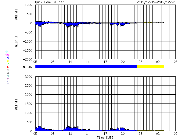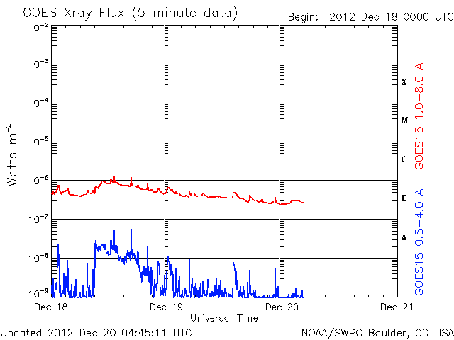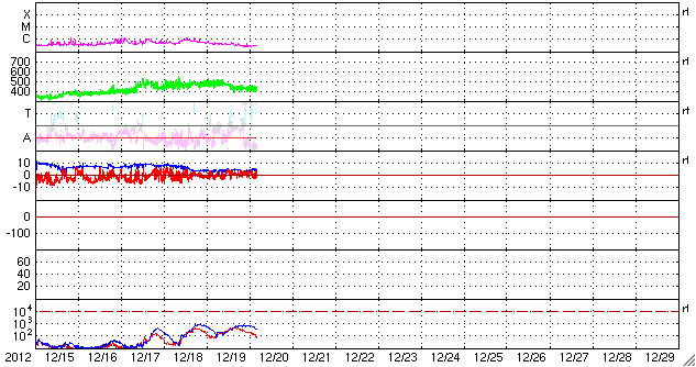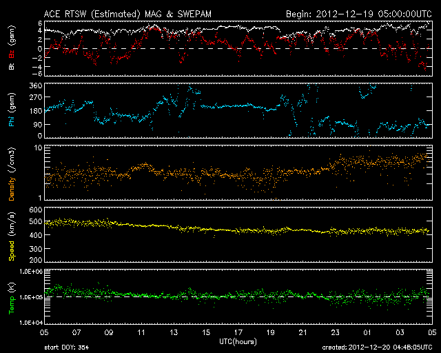 2012/12/20 13:50 更新 太陽風は平均的な速度に戻っています。太陽も穏やかです。 担当 篠原 太陽風はゆっくりと速度が下がって、 420km/秒と平均的な状態に戻っています。 太陽風磁場の南北成分がある程度南北に振れ続けいているためか、 磁気圏では小さな活動が時々発生していて、 AE指数のグラフは、250nTほどの小さな変化が断続的に見られています。 太陽風の弱い高まりが通り過ぎて、 これからしばらく穏やかな風が続きそうです。 27日周期の図を見ると、 前周期の11月24日に太陽風の乱れが到来していますが、 これはCMEによる突発性の擾乱で、周期性はありません。 太陽は、中央付近に1633群と1634群の黒点が三角形に並び、 東の端からは1635群が姿を現していますが、 GOES衛星のX線グラフは、全体的な強度が下がっていて、 太陽の活動度は弱くなっている様です。 STEREO Behind衛星で太陽の東の向こう側を見ても、 特に活動的な領域はなく、太陽もしばらく静かに推移しそうです。 21日の夕方から25日の朝まで、 高専内のネットワークが停止するため、 宇宙天気ニュースへのアクセスができなくなります。 (私は更新ができなくなります) 週末と連休が重なるために、3日半にわたってしまいます。 大変申し訳ありません。 残り時間があまりありませんが、対策を考えています・・・ ![]() SDO衛星のAIA193カメラによる太陽コロナの様子 (c) SDO (NASA) ![]() SDO衛星による太陽の可視光写真。マウスの矢印を写真に重ねると、黒点番号付きの写真に切り替わります。 (c) SDO (NASA) ![]() ACEが観測した太陽風の磁場(1番上の枠、白線は全体の強度、赤線は南北成分) および、太陽風の密度(3番目の橙線)、速度(4番目の黄線) (c) NOAA/SWPC ![]() リアルタイムAE指数 下段のAEグラフの値が高くなると、オーロラ活動が活発化しています。 (c) 京都大学, NICT ![]() 27日の太陽周期に合わせたデータプロット 太陽が同じ面を地球に向けていた27日前の変化から、今後を予想することができます。 (c) 作図:宇宙天気ニュース