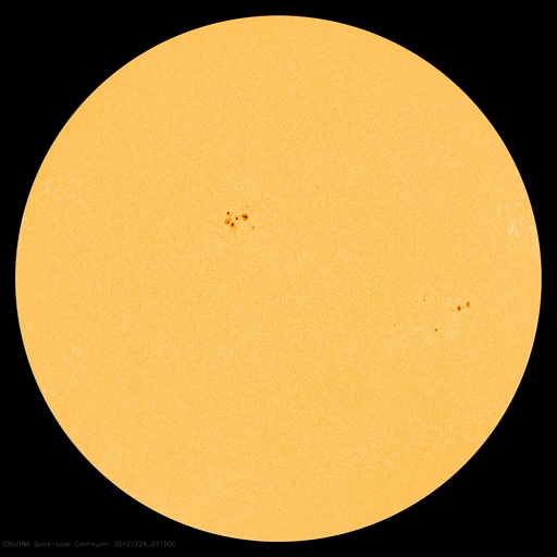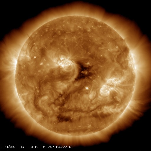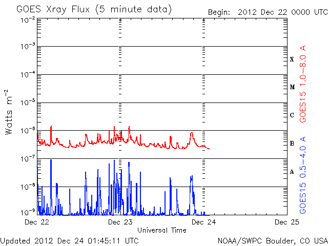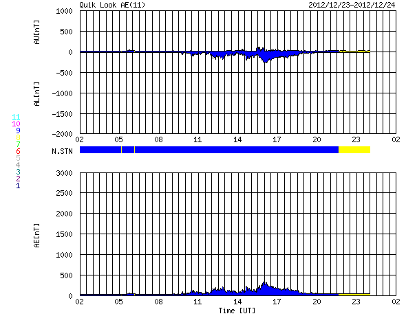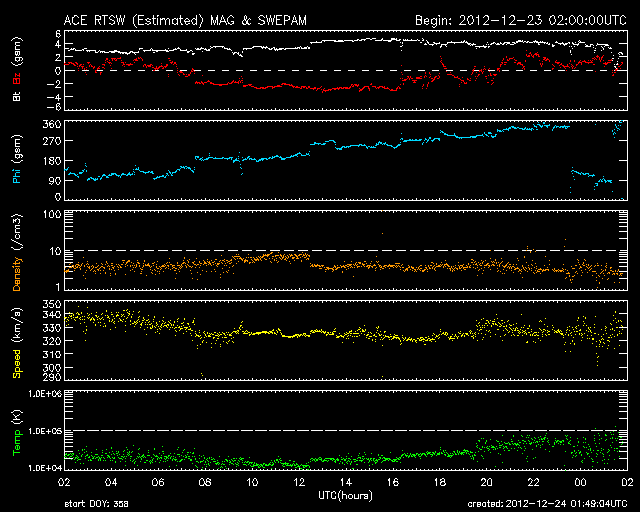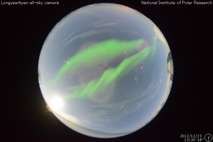 2012/12/24 11:00 更新 太陽風は低速です。磁場の南向きにより弱いオーロラ活動が発生しています。 担当 篠原 太陽風の速度は、320〜330km/秒に下がったまま、 穏やかな状態が続いています。 磁場強度は少し戻って、4nTになりましたが、 最新の値は2nTにまた下がっています。 太陽風磁場のセクターが切り替わりつつあるようです。 この間に、太陽風磁場の南北成分が、 -3nT程の弱い南向きの時間が続いています。 このため、磁気圏でも弱い活動が発生して、 AE指数のグラフでは、 200nTの小さな変化が数時間続いています。 この時間帯に、 ノルウェーの北方のLongyearbyenに現われたオーロラを、 全天カメラの写真で紹介します。 オーロラの2本の帯が、空を横切っています。 左下で明るく輝いているのは、月です。 太陽風は、このまま穏やかに推移して、 26日か27日くらいに、 SDO衛星AIA193の中央部に見えるコロナホールの影響が、 地球に到来しそうです。 太陽は、1635黒点群でC1.5、1633黒点群でC1.3と、 小さな活動が見られた程度です。 X線グラフの変化もやや弱まっています。 一方、GOES衛星のX線カメラの動画を見ていると、 東の端の向こう側から、 活動的な領域が近付いているようです。 特に活発という規模でもありませんが、 どの様な領域が現われるか、注目してください。 手作業の記事更新も今日までです。 明日のお昼には、いつものWebページに戻れると思います。