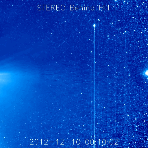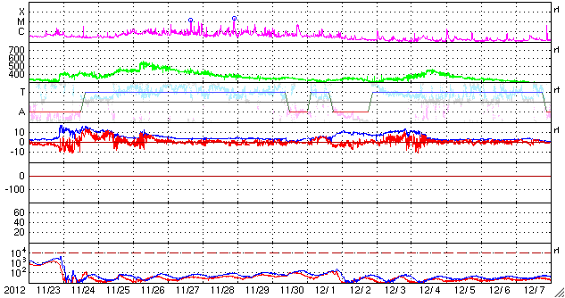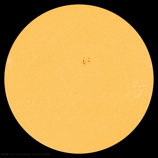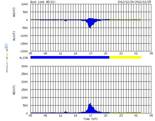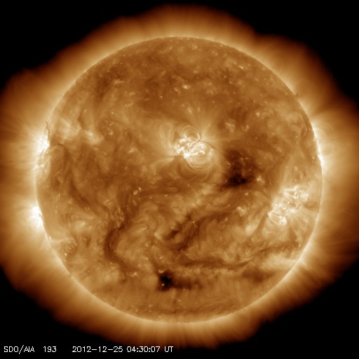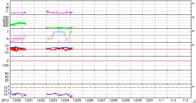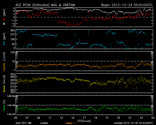 2012/12/25 13:43 更新 太陽風は低速で、磁気圏も概ね静穏です。太陽の活動もC1程度です。 担当 篠原 19日のニュースで、STEREO Behind衛星のHi1カメラに 地球が入ってきたことを紹介しましたが、 その後、高画質の写真がダウンロードされたので(現時点で20日分まで)、 もう一度出現前後の様子を動画にしました。 遥か、太陽越しに眺める地球の光です。 衛星と地球は、2億8000万kmも離れています。 太陽風は、低速の風が続いています。 速度は、330km/秒付近で安定しています。 磁場強度も、3〜5nTと平均的かやや弱めの値で推移しています。 ACE衛星のグラフの途中に、 太陽風磁場が-5nTと南向きに強まった時間帯があります。 この影響で、オーロラの活動が高まった様で、 AE指数を見ると、500nTと中規模の変化が1回だけ発生しています。 その他の時間帯では、太陽風磁場は北向きか、0nT付近にあり、 磁気圏も静穏でした。 SDO衛星AIA193を見ると、 太陽の赤道近くにあるコロナホールは、西半球側にだいぶ移動しています。 地球へ影響が及ぶのであれば、明日、明後日くらいに始まりそうです。 あまり大きな変動にはならないと思いますが、 太陽風の速度が400km/秒台後半に上がるか、500km/秒に達するか、 あるいはほとんど変化は来ないのか、 今年最後の擾乱になりそうですので、注目して下さい。 太陽は、1635黒点群でC1.7、 1633黒点群でC1.2の小さなフレアが起きた程度です。 1633、1634黒点群はすっかり小さくなり、 1635黒点群も次第に小さくなっている印象です。 一方、太陽の東の端に新しい黒点が顔を出しています。 規模は小さい様です。 ![]() STEREO Behind衛星のHI1カメラ右端の地球出現の様子。 (c) STEREO (NASA)、 (動画加工 : 宇宙天気ニュース) ![]() SDO衛星のAIA193カメラによる太陽コロナの様子 (c) SDO (NASA) ![]() SDO衛星による太陽の可視光写真。マウスの矢印を写真に重ねると、黒点番号付きの写真に切り替わります。 (c) SDO (NASA) ![]() ACEが観測した太陽風の磁場(1番上の枠、白線は全体の強度、赤線は南北成分) および、太陽風の密度(3番目の橙線)、速度(4番目の黄線) (c) NOAA/SWPC ![]() リアルタイムAE指数 下段のAEグラフの値が高くなると、オーロラ活動が活発化しています。 (c) 京都大学, NICT ![]() 27日の太陽周期に合わせたデータプロット 太陽が同じ面を地球に向けていた27日前の変化から、今後を予想することができます。 (c) 作図:宇宙天気ニュース