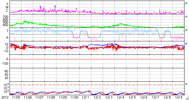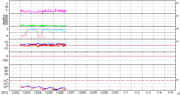 2012/12/25 13:43 太陽風は低速で、磁気圏も概ね静穏です。太陽の活動もC1程度です。