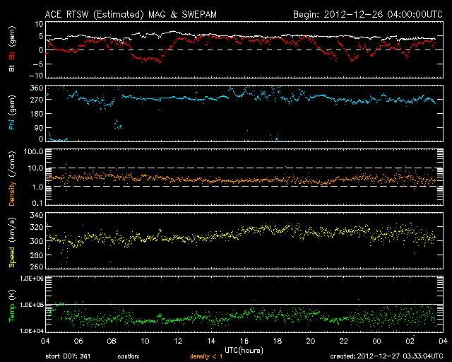 2012/12/24 11:00 太陽風は低速です。磁場の南向きにより弱いオーロラ活動が発生しています。