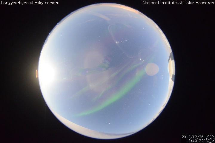 ノルウェーのスバールバル島Longyearbyenで全天カメラによって撮影されたオーロラ。