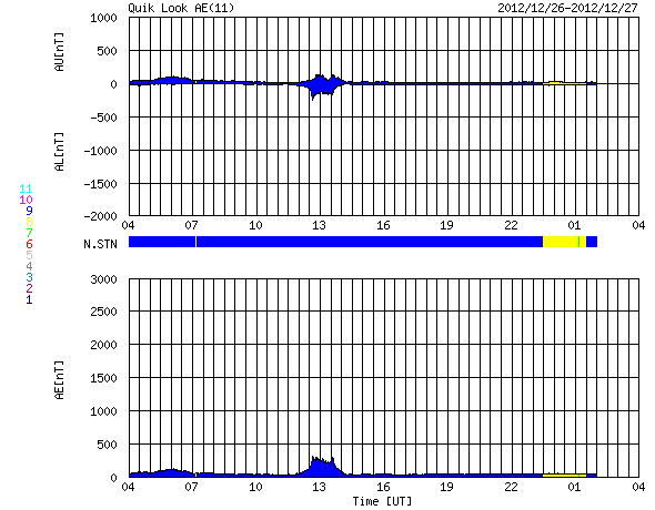 下段のAEグラフの値が高くなると、オーロラ活動が活発化しています。