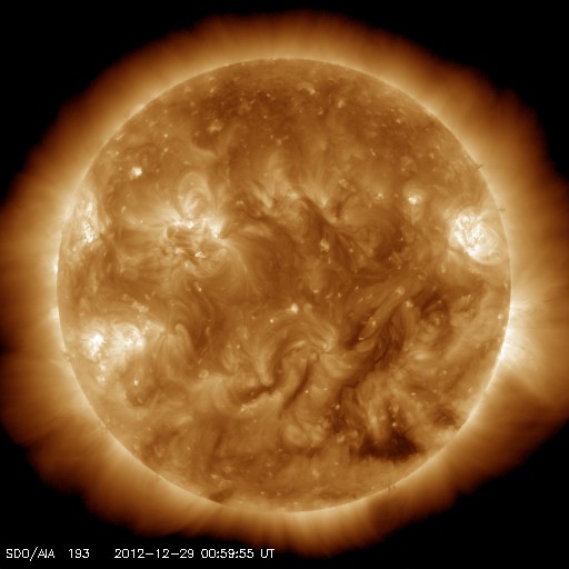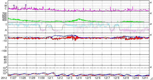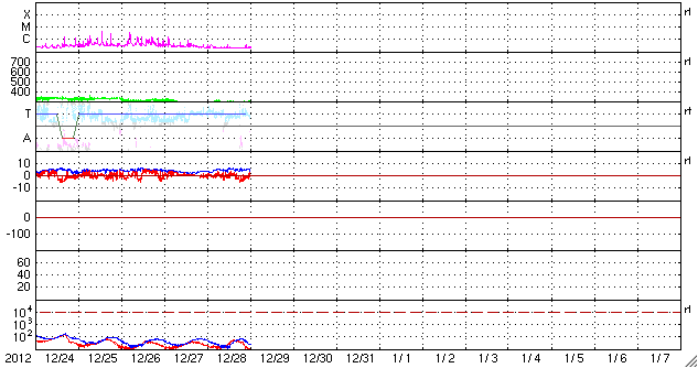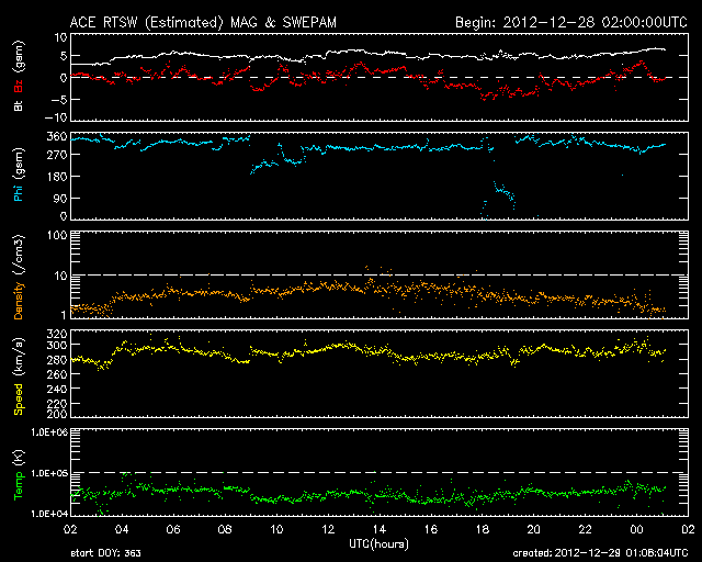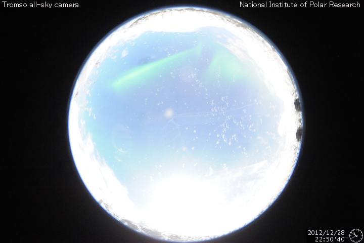 2012/12/29 10:09 更新 太陽風はかなり低速の風が続いています。太陽の活動も静かです。 担当 篠原 太陽風は、280〜300km/秒とかなり遅い風が続いています。 磁場強度は少し高まって、5nTを推移しています。 ACEの図の最後では、6nTへ少しだけ上がっていますが、 この変化が更に高まって、 27日周期の前周期(12月1〜4日)に見られたような、 太陽風磁場の強まりになるのか、 一時的に高まっただけで、この後弱まってしまうのか、 変化に注目してください。 太陽風磁場の南北成分は、振れ幅は小さいですが、 南北それぞれに振れています。 このため、弱いオーロラ活動は発生しているようで、 AE指数で100〜200nTの小さい変化が発生したり、 ノルウェー・トロムソの全天カメラでオーロラが撮影されたりしています。 全天カメラについては、明るい月に照らされた雲の隙間を眺めているので、 撮影条件としてはかなり厳しい様です。 カメラの透明の覆いのあちこちに、雪が残っているのが見えます。 太陽のフレア活動も更に静かになっています。 昨日は、Bクラスの変化も数少なくなっています。 ![]() ノルウェー・トロムソの全天カメラで撮影された、雲の隙間から見えた淡いオーロラ。 (c) 国立極地研究所 ![]() SDO衛星のAIA193カメラによる太陽コロナの様子 (c) SDO (NASA) ![]() SDO衛星による太陽の可視光写真。マウスの矢印を写真に重ねると、黒点番号付きの写真に切り替わります。 (c) SDO (NASA) ![]() ACEが観測した太陽風の磁場(1番上の枠、白線は全体の強度、赤線は南北成分) および、太陽風の密度(3番目の橙線)、速度(4番目の黄線) (c) NOAA/SWPC ![]() リアルタイムAE指数 下段のAEグラフの値が高くなると、オーロラ活動が活発化しています。 (c) 京都大学, NICT ![]() 27日の太陽周期に合わせたデータプロット 太陽が同じ面を地球に向けていた27日前の変化から、今後を予想することができます。 (c) 作図:宇宙天気ニュース