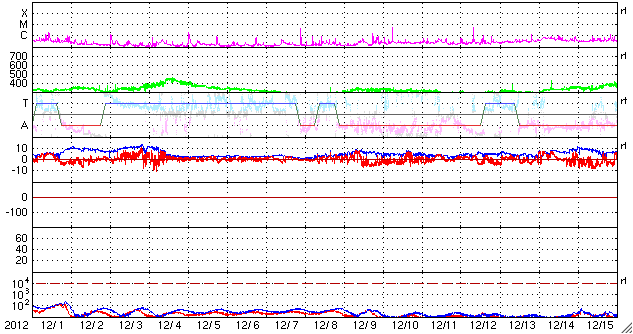 (c) 黒点データ:SIDC、作図:宇宙天気ニュース ![]() SDO衛星による、2012年12月の27日間の太陽。黒点数の月平均値は40.8。 (c) SDO (NASA)、(動画加工 : 宇宙天気ニュース ) ![]() SDO衛星による、第24期で黒点数最高(月平均値96.7)だった2011年11月の27日間の太陽。 (c) SDO (NASA)、(動画加工 : 宇宙天気ニュース ) ![]() SDO衛星のAIA193カメラによる太陽コロナの様子 (c) SDO (NASA) ![]() SDO衛星による太陽の可視光写真。マウスの矢印を写真に重ねると、黒点番号付きの写真に切り替わります。 (c) SDO (NASA) ![]() GOES衛星の太陽X線データ (c) NOAA/SWPC ![]() ACEが観測した太陽風の磁場(1番上の枠、白線は全体の強度、赤線は南北成分) および、太陽風の密度(3番目の橙線)、速度(4番目の黄線) (c) NOAA/SWPC ![]() リアルタイムAE指数 下段のAEグラフの値が高くなると、オーロラ活動が活発化しています。 (c) 京都大学, NICT ![]() 27日の太陽周期に合わせたデータプロット 太陽が同じ面を地球に向けていた27日前の変化から、今後を予想することができます。 (c) 作図:宇宙天気ニュース