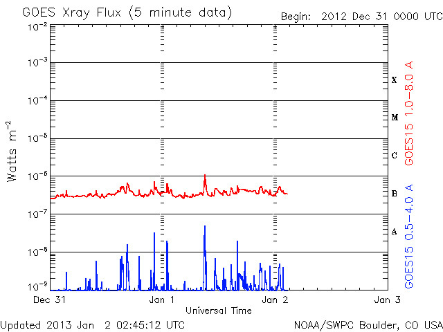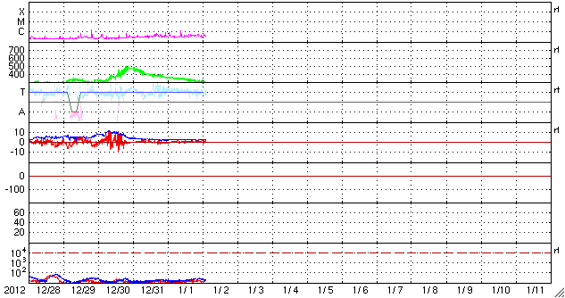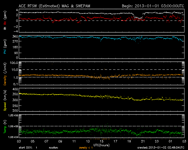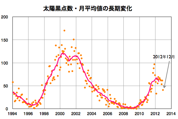 2013/ 1/ 2 11:48 更新 太陽風は300km/秒の低速風になりました。12月の黒点数は40.8でした。 担当 篠原 SIDCより2012年12月の太陽黒点相対数が発表されました。 それによると、12月の月平均値は40.8と大きく下がっています。 50を割るほどに下がったのは、 2012年2月の32.9以来です(この時も大きく下がりました)。 1994年以降の太陽黒点数の変化を1枚目の図に掲載します。 前の周期である第23活動周期の変化もそうですが、 太陽の黒点数は短い期間に大きく増減を繰り返しています。 先月は、その中の谷の部分に当たったのでしょう。 極大が終わったという様な変化ではないと思いますので、 今月以降の変化に注目してください。 それにしても、最近太陽が静かになっていると感じていましたが、 黒点数のデータでもその様子がよく分かります。 現在の第24活動周期の中で黒点数が最大になったのは、 2011年11月の96.7でした。 これと比べると、2012年12月の40.8は半分以下です。 黒点の現われ方がどのくらい違ったのか、 SDO衛星の可視光写真でそれぞれの月を早送りして比べてみます。 2枚目、3枚目の動画をご覧ください。 27日間を動画にしているので、 それぞれ太陽を1周させていると考えて下さい。 黒点の現われ方にずいぶん違いを感じます。 前の第23期の極大期の黒点数を見ると、 ほとんどの月で100を越えていて、 2011年11月の96.7という値でも最も少ないグループに相当します。 ちなみに、前周期の月平均値の最高は2000年7月の170.1でした。 現在の太陽は、発達の目立っていた1640黒点群で、 昨日の夕方にC1.2の小規模フレアが発生した程度で、 全体的な活動は穏やかです。 東の端からもうひとつ新しい黒点群が現われましたが、 特に目立った活動は起こしていません。 太陽風も、速度が350km/秒から300km/秒へ更に下がり、 遅い風になっています。 磁場強度も2〜3nTに弱まったままです。 そして、太陽風磁場の南北成分は、 小さい振幅ですが北向きに振れ続けています。 このため磁気圏もとても静かで、AE指数は全く変化していません。 低速の穏やかな太陽風は、しばらく続きそうです。 SDO衛星AIA193の太陽コロナ写真は、 中央の左寄りに小さなコロナホールが見える程度で、 あまり大きな乱れは到来しそうにありません。
