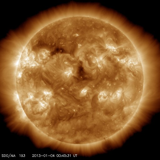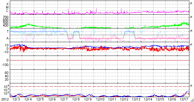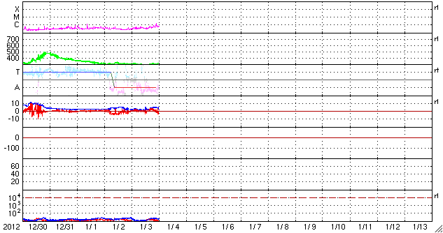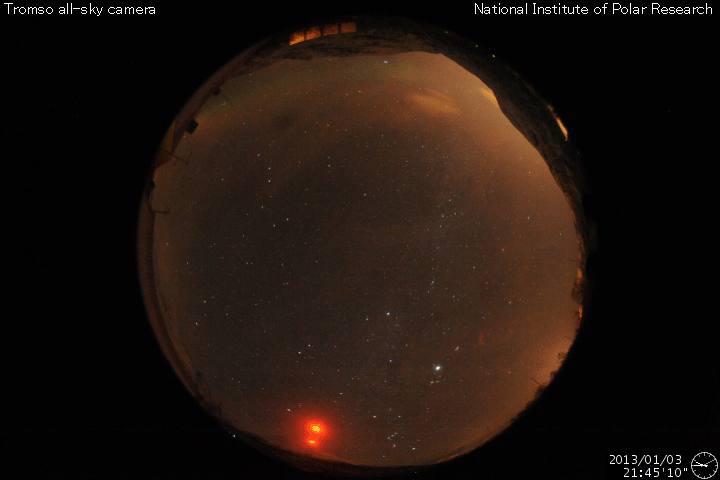 2013/ 1/ 4 09:51 更新 太陽風は300km/秒と低速の風が続いています。太陽の黒点が増えています。 担当 篠原 昨日に続いて、ノルウェー・トロムソのオーロラを紹介します。 今日の動画では、オーロラはトロムソの北の空に低く輝いています。 太陽風が弱まっている時は、 高緯度側の空に光っていることがよくあります。 現在の太陽風は、 速度(ACEの図の黄色線)は300〜320km/秒と低速の状態が続いています。 2nTに弱まっていた磁場強度(白線)は、 今日に入った頃から5nTと平均的な値に高まっています。 ACE衛星のグラフの最後のところで、 磁場の南北成分(赤線)が 北向き(プラス側)から南向き(マイナス側)へ変化しています。 掲載した動画のオーロラは、この辺りの時間帯に見られたものです。 太陽風の磁場は、最後に-4nT近くまで南向きに振れていて、 この辺りでもう一段強いオーロラが発生した可能性もあるのですが、 トロムソの空は曇ってしまいました。 SDO衛星AIA193の太陽コロナ写真では、 太陽の中心付近に小さいですが、 コロナホールの暗い領域が見えています。 このコロナホールは、前周期(27日前)の太陽にはありませんでした。 27日周期の図の前周期の太陽風は、 今後も300km/秒台前半の低速の風が続いていますが、 今回は、この小さなコロナホールの影響が多少見られるかもしれません。 3〜4日後の1月7〜8日頃の太陽風の変化に注目してください。 太陽は、新しい黒点があちこちに現われていて、 可視光写真がにぎやかになっています。 中心部に現われた黒点には、1645黒点群と番号が付きました。 また、北西部にひとつと、東端にふたつ、 それぞれ新しい黒点が現われています。 フレアは、1640黒点群で発生したC1.7の小規模フレア程度です。 久しぶりにフレアの活動度が高まるかどうか、 新しい黒点群の様子に注目してください。 ![]() ノルウェー・トロムソの全天カメラで撮影された、北の空に低く輝くオーロラ。 (c) 国立極地研究所、(動画加工 : 宇宙天気ニュース) ![]() SDO衛星のAIA193カメラによる太陽コロナの様子 (c) SDO (NASA) ![]() SDO衛星による太陽の可視光写真。マウスの矢印を写真に重ねると、黒点番号付きの写真に切り替わります。 (c) SDO (NASA) ![]() ACEが観測した太陽風の磁場(1番上の枠、白線は全体の強度、赤線は南北成分) および、太陽風の密度(3番目の橙線)、速度(4番目の黄線) (c) NOAA/SWPC ![]() リアルタイムAE指数 下段のAEグラフの値が高くなると、オーロラ活動が活発化しています。 (c) 京都大学, NICT ![]() 27日の太陽周期に合わせたデータプロット 太陽が同じ面を地球に向けていた27日前の変化から、今後を予想することができます。 (c) 作図:宇宙天気ニュース