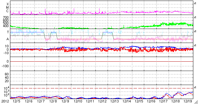 (c) SDO (NASA) ![]() SDO衛星AIA131カメラによる、太陽北東端の1652黒点群で発生したフレア。 (c) SDO (NASA)、 (動画加工 : 宇宙天気ニュース) ![]() SDO衛星のAIA193カメラによる太陽コロナの様子 (c) SDO (NASA) ![]() SDO衛星による太陽の可視光写真。マウスの矢印を写真に重ねると、黒点番号付きの写真に切り替わります。 (c) SDO (NASA) ![]() GOES衛星の太陽X線データ (c) NOAA/SWPC ![]() ACEが観測した太陽風の磁場(1番上の枠、白線は全体の強度、赤線は南北成分) および、太陽風の密度(3番目の橙線)、速度(4番目の黄線) (c) NOAA/SWPC ![]() リアルタイムAE指数 下段のAEグラフの値が高くなると、オーロラ活動が活発化しています。 (c) 京都大学, NICT ![]() 27日の太陽周期に合わせたデータプロット 太陽が同じ面を地球に向けていた27日前の変化から、今後を予想することができます。 (c) 作図:宇宙天気ニュース