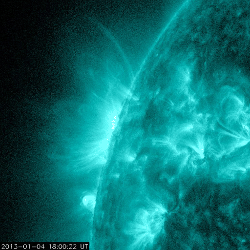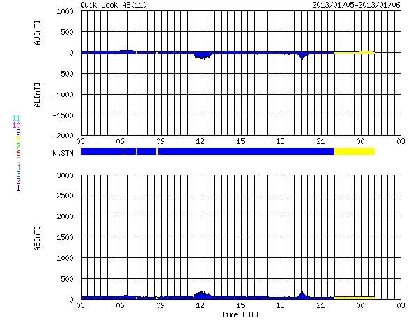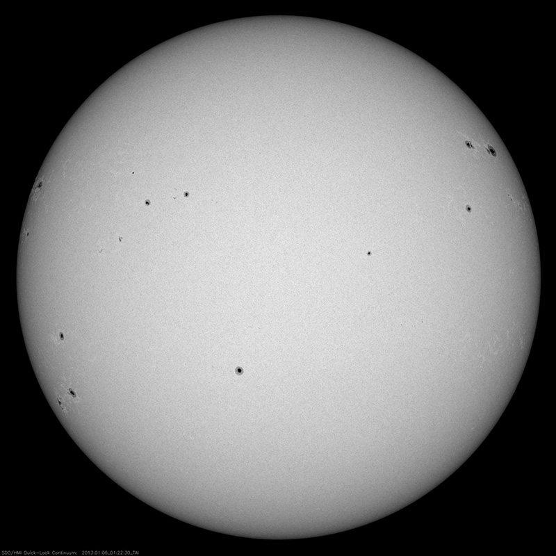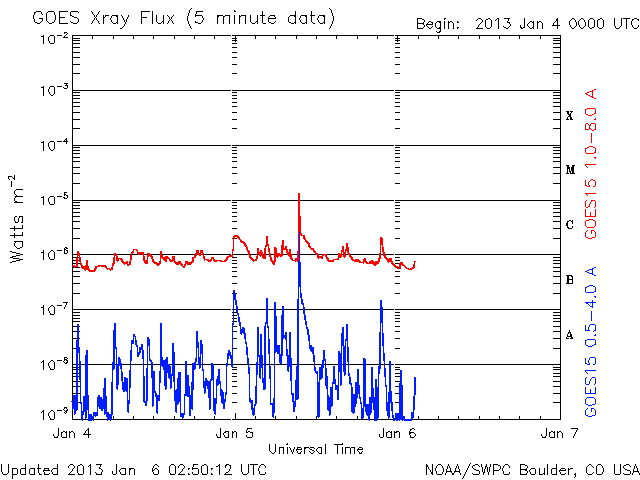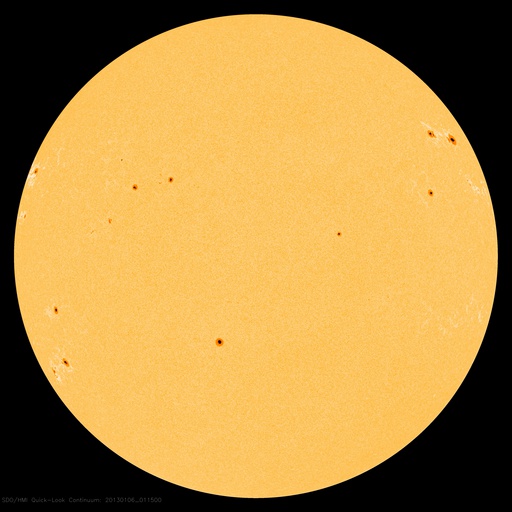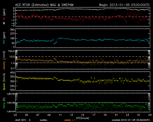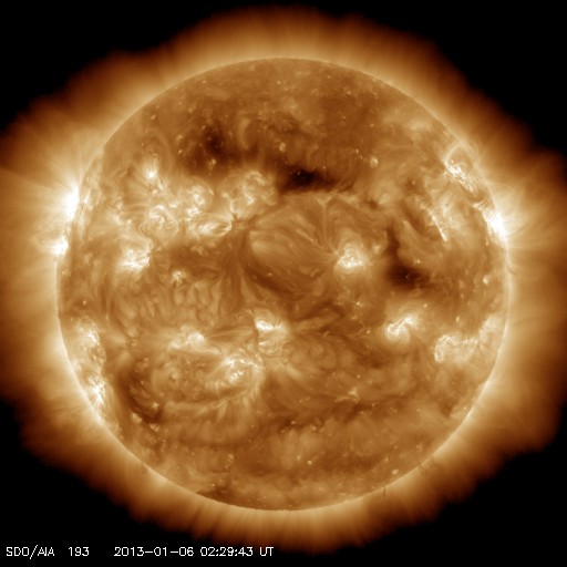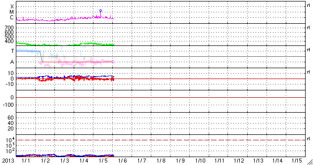 2013/ 1/ 6 11:50 更新 太陽の黒点群が14個に増えています。M1.7のフレアが発生しました。 担当 篠原 太陽の北東端(左上)から1652群、1653群と 2つの黒点群が姿を現しました。 このため、黒点群リストは14個の群番号が並んでいます。 太陽面は西(右)から東(左)まで黒点がずらっと並んでいます (南西部が空いているくらいです)。 壮観ですので、太陽の可視光写真を1枚目に大きく掲載します。 黒点の群番号は、下の通常の可視光写真を参照して下さい。 丸っこい黒点が目立っていて、 形が複雑で規模の大きな黒点群が見られないのが残念な気もします。 SIDCのデータによると、 現在の第24活動周期の黒点相対数のこれまでの最高値は、 2011年10月21日の136でした。 今日の黒点相対数がいくつになるのかは、 来月初めのSIDCの発表を待つ必要がありますが、 今期の最高記録を更新するかもしれません。 昨夕、5日18時半(世界時5日9時半)に、 東の端から現れた1652黒点群でM1.7の中規模フレアが発生しました。 Mクラスのフレアの発生は、 2012年11月28日のM2.2以来、およそ40日ぶりです。 1652黒点群は、その前にC2.3のフレアも起こしています。 2つのフレアの様子を、SDO衛星AIA131カメラの動画でご覧ください。 1つめのフレアは、太陽の向こう側で発生していた様に見えます。 実際にはより規模の大きい現象だったのかもしれません。 この他にも、1650黒点群、1653黒点群でC1〜2のフレアが発生しています。 太陽の東側の活動に注目してください。 太陽風は、速度が350km/秒から300km/秒に下がり、 遅い速度の風になっています。 磁場強度も4〜5nTで安定しています。 磁場の南北成分は、やや南寄りになっています。 振れ幅は小さいのですが、 その影響でAE指数には小さな変化が発生しています。 極域では弱いオーロラの活動が見られたのかもしれません。 SDO衛星AIA193を見ると、 コロナホールの先頭(右端)は西半球の中程に進んでいます。 明日くらいからこの領域の影響が到来するかもしれません。 太陽風は弱い変化に留まると思いますが、 磁場が強まって南向きに振れると、 活発なオーロラの活動を起こす可能性があります。