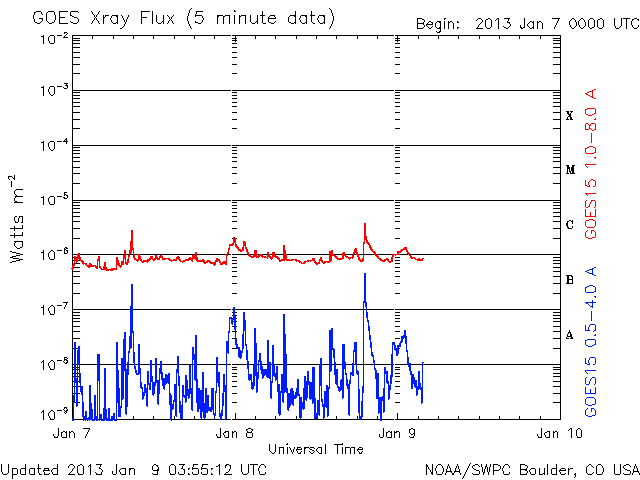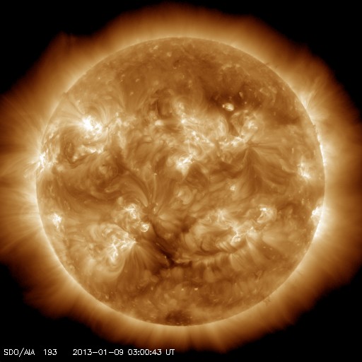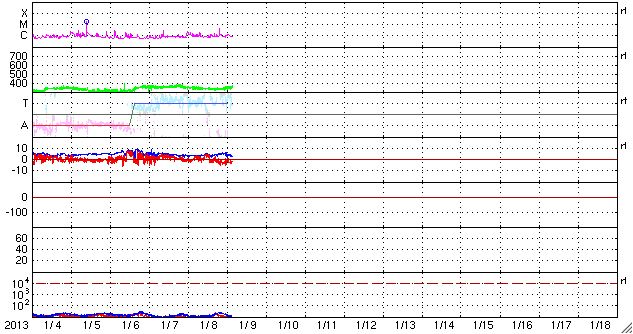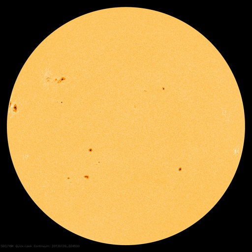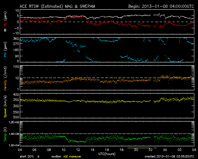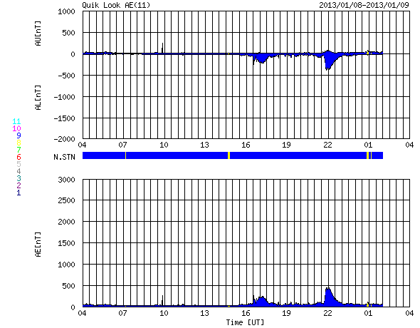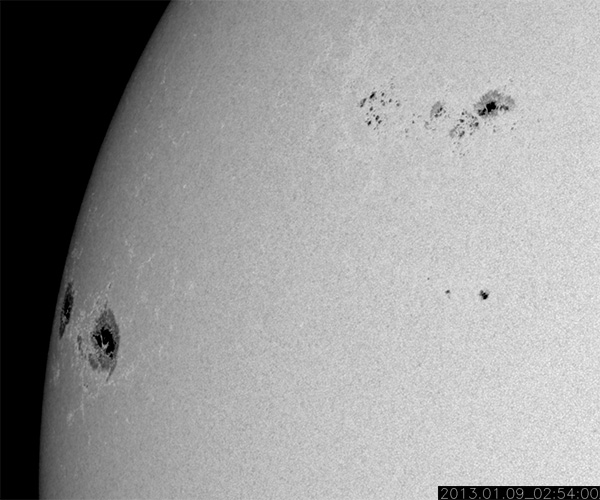 2013/ 1/ 9 12:57 更新 太陽の東端から大きな黒点が姿を現しています。太陽風は低速です。 担当 篠原 太陽の東端から、1654黒点群が大きな姿を現しています。 となりの1652黒点群とともに、拡大写真を紹介します。 今のところ活動は静かで、特にフレアは起こしていません。 フレアとしては、西の端に没した1640黒点群で発生した、 C4.0のフレアが目立っています。 太陽はあちこちに黒点が現われているので、 引き続き注目してください。 太陽風は、速度(ACEの黄色線)は350km/秒と低速の状態で安定し、 磁場強度(白線)も4〜5nTと平均的な強さが続いていて、穏やかです。 しかし、磁場の南北成分(赤線)は、図の後半から南寄りになり、 -3〜-4nTくらいに振れ続けています。 磁気圏への影響も現れていて、 AE指数のグラフでは、 300〜500nTの小規模の変化が2回ほど発生しています。 ノルウェーの全天カメラでも、オーロラの輝きが撮影されています。 このまま磁場の南寄りの傾向が続けば、 これからカナダやアラスカのカメラはチャンスになるでしょう。 昨日紹介した太陽の南半球のコロナホールは、 今日のSDO衛星AIA193ではほとんど見えなくなっています。 地球への影響は弱くなりそうです。 ![]() 太陽の東端から現れた1654黒点群と、隣りの1652黒点群。SDO衛星による。 (c) SDO (NASA) ![]() SDO衛星のAIA193カメラによる太陽コロナの様子 (c) SDO (NASA) ![]() SDO衛星による太陽の可視光写真。マウスの矢印を写真に重ねると、黒点番号付きの写真に切り替わります。 (c) SDO (NASA) ![]() GOES衛星の太陽X線データ (c) NOAA/SWPC ![]() ACEが観測した太陽風の磁場(1番上の枠、白線は全体の強度、赤線は南北成分) および、太陽風の密度(3番目の橙線)、速度(4番目の黄線) (c) NOAA/SWPC ![]() リアルタイムAE指数 下段のAEグラフの値が高くなると、オーロラ活動が活発化しています。 (c) 京都大学, NICT ![]() 27日の太陽周期に合わせたデータプロット 太陽が同じ面を地球に向けていた27日前の変化から、今後を予想することができます。 (c) 作図:宇宙天気ニュース