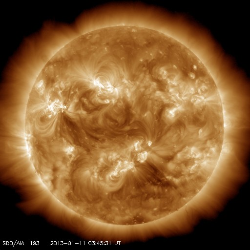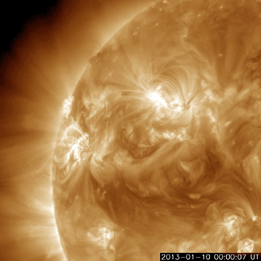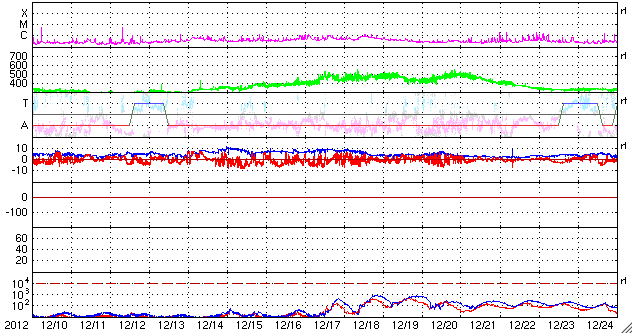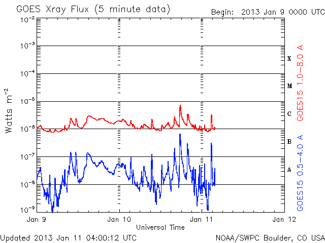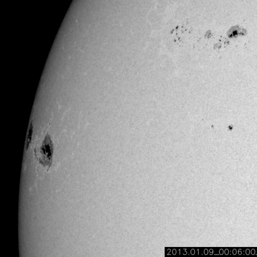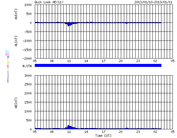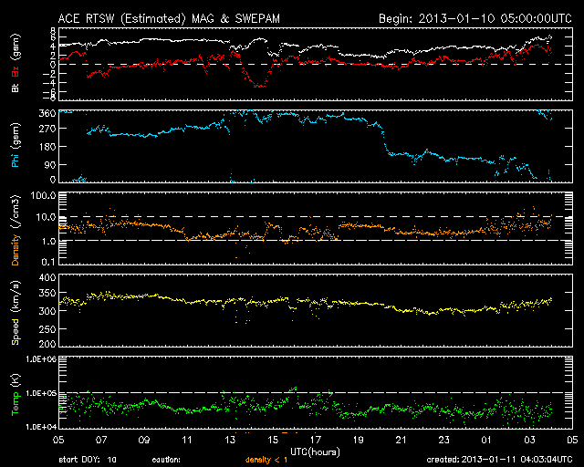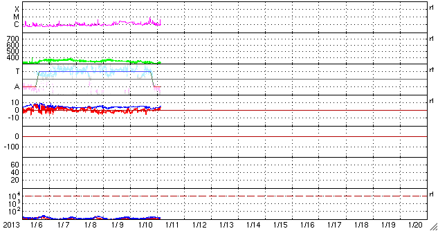 2013/ 1/11 13:03 更新 1654黒点群でC8のフレアが発生しました。黒点の変化が目立っています。 担当 篠原 1654黒点群の形の変化が目立っています。 この2日間の様子を、SDO衛星の可視光写真による動画で紹介します。 特に後半の動きが目立っています。 それとともに、1654黒点群のフレアの活動も活発化しています。 今日の未明、11日2時半(世界時10日17時半)のC8.0を最大として、 昨日のニュース以降、C1〜4のフレアが10回ほど発生しています。 SDO衛星AIA193の動画を見ると、 ちかちかと小さな輝きが頻繁に発生しています。 今後、Mクラスのフレアなどが発生するかもしれません。 今後の変化に注目してください。 太陽風は、300〜330km/秒と低速の状態が続いています。 磁場強度は、4nTから2nTに一旦下がって、 再び5nTに強まっています。 27日周期の図を見ると、 この頃に太陽風磁場のセクター境界を通過したようです。 磁気圏は静穏です。 AE指数はほとんど変化していません。