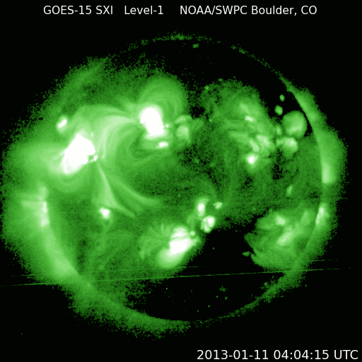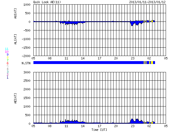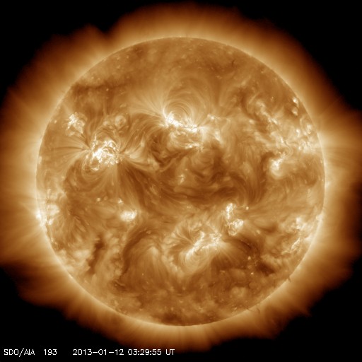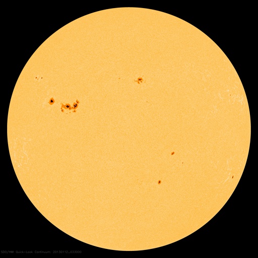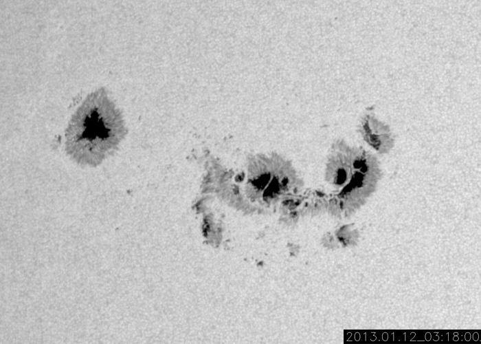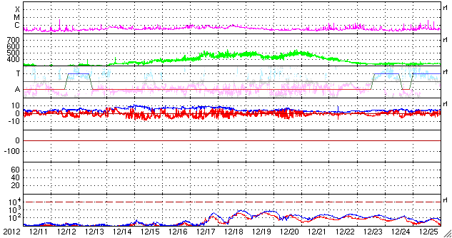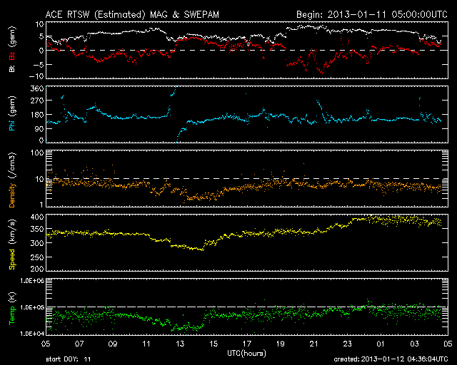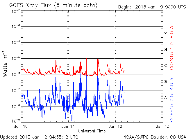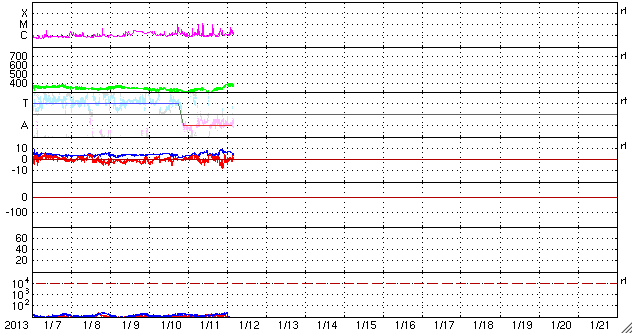 2013/ 1/12 13:36 更新 1654黒点群で、M1のフレアが2回発生しました。今後も活動は続きそうです。 担当 篠原 太陽の中央やや左上に大きく発達した1654黒点群は、 昨夕、1月11日18時(世界時11日9時)にM1.2、 深夜、12日0時(世界時11日15時)にM1.0と、 Mクラスの中規模フレアを2回起こしました。 その前にも、C9.2と大きいCクラスフレアや、 C1〜C5のフレアを10回ほど発生させています。 活発になった様子を、GOES衛星X線カメラの動画で紹介します。 この24時間の活動です。 チカチカと頻繁にフレアの輝きが発生しています。 X線のグラフでも短時間の変化は頻繁に発生しています。 次に、SDO衛星の可視光拡大写真で、 複雑に発達した1654黒点群の姿をご覧ください。 今日の鹿児島は晴天なので、太陽メガネで太陽を見たところ、 なんとか1654黒点群を肉眼で見つけることができました。 太陽の中心に近づいてきたので、昨日より見易くなっている印象です。 もし、日食用の太陽メガネなどをお持ちでしたら、 挑戦してはいかがでしょうか。 1654黒点群は今後もフレアの発生が続く可能性があります。 引き続き注目してください。 太陽風は、今朝くらいから速度が380km/秒ほどに少し上がっています。 磁場強度も一時的に8nTくらいに上がるなどしています。 27日周期の図で、前周期(12月17〜21日頃)に見られた太陽風の高まりが 回帰しようとしているのかもしれません。 AE指数には200nTほどの小さな変化が記録されています。 極域ではオーロラの活動がある程度発生したのかもしれません。 太陽風の磁場強度は5nT程度を推移しています。 南北成分が南を向くと、オーロラ観望のチャンスになりそうです。