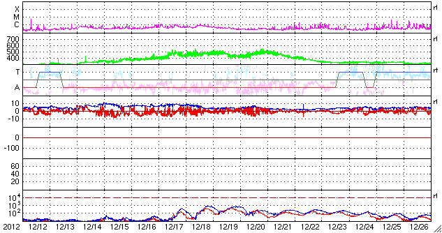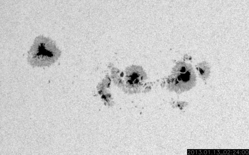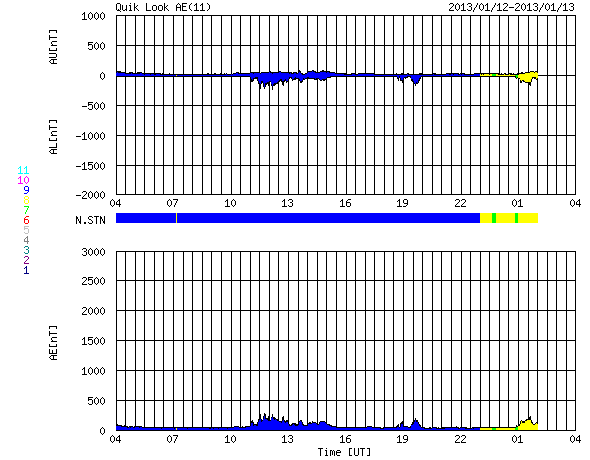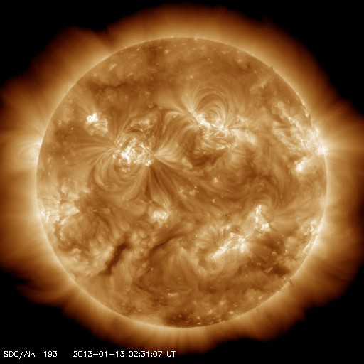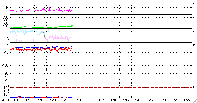 2013/ 1/13 12:36 更新 M1.0の中規模フレアが発生しました。ムルマンスクのオーロラ写真をご覧ください。 担当 篠原 ロシア・ムルマンスクの福島さんより、 ムルマンスク州中央にある州最大の湖イマンドラ湖上で 1月12日に撮影されたオーロラの写真が届きました。 昨日のニュースのAE指数のグラフで見られた 小さな変動の頃に撮影された写真かもしれません。 雲越しに鮮やかなオーロラの光が見えています。 透明感のある美しい写真です。 画面手前は湖面でしょうか。 白く凍りついているように見えますね。 福島さんによると、 ムルマンスク市では1月11日にやっと初日の出が観測されたそうです。 送っていただいたオーロラ写真としては、2013年第一号です。 どうもありがとうございます。 太陽風は、速度は370km/秒から400km/秒に、 磁場強度は5nTから7nTに、それぞれ少しだけ高まっています。 27日周期の図の前周期に見られた太陽風の弱い高まりが 戻ってきている様です。 前周期通りであれば、 これから4〜5日程度太陽風の高まりが続く可能性があります。 前周期のこの期間は、オーロラもやや活動的な状態が続きました。 引き続き注目してください。 太陽は、昨日のニュースの後しばらく静かになっていましたが、 日本時間で今日、13日に入った頃から、 1654黒点群と右側の1652黒点群でフレアが増え始め、 C1〜4程度のフレアが、1654群で4回、1652群で3回発生して、 今朝、13日10時(世界時13日1時)に、 1652黒点群でM1.0の中規模フレアが発生しました。 この他にも、1656黒点群や、東端から現れた新しい領域でも 小さな活動が発生していて、太陽の動きにも注目してください。 1653黒点群は、今日も大きな姿を保っています。 今日の鹿児島は雨で、太陽を見ることができないのですが、 まだ肉眼で見つけることができるかもしれません。 日食用の太陽メガネなどを使って、挑戦してはいかがでしょうか。