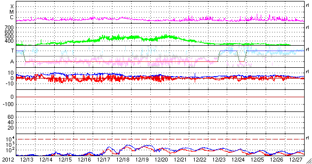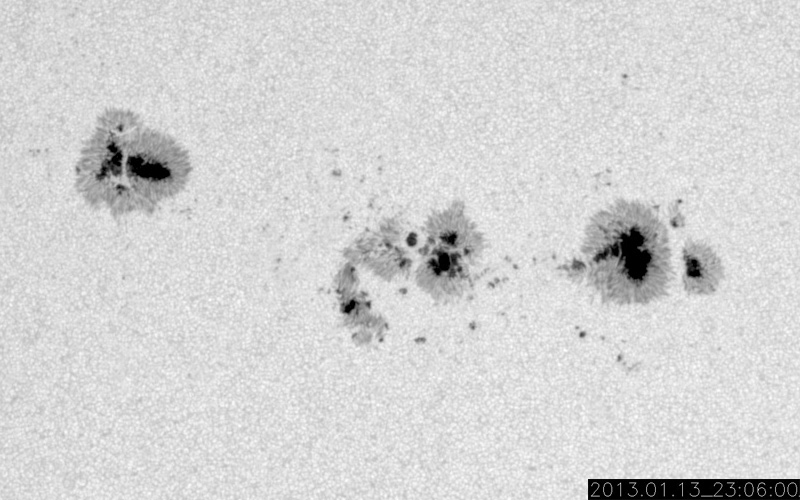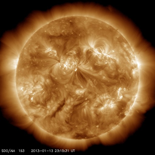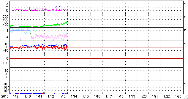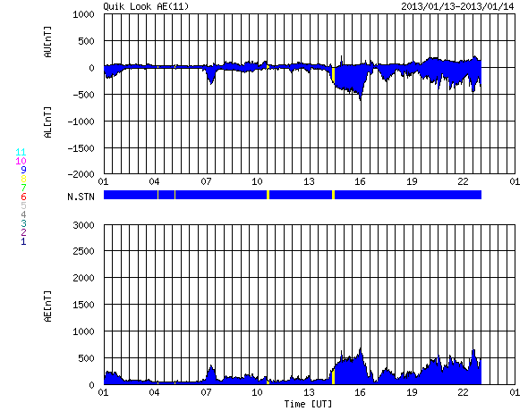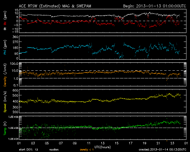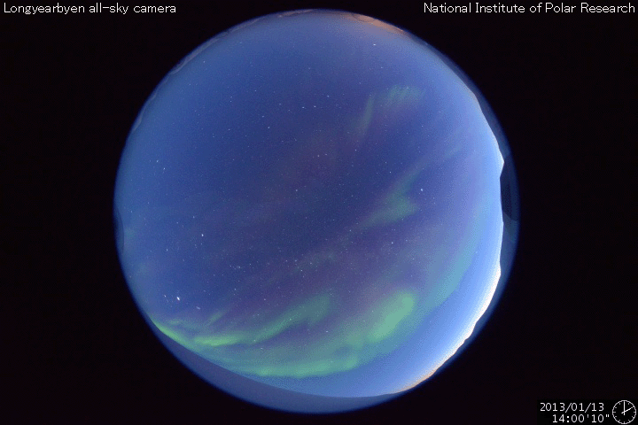 2013/ 1/14 09:12 更新 太陽風の速度が500km/秒に上がっています。M1.7の中規模フレアが発生しました。 担当 篠原 国立極地研究所がノルウェー・スバールバル島の Longyearbyenに設置している全天カメラで、 空が暗くなって行く頃から夜にかけて、 きれいなオーロラの活動が撮影されていました。 ファイルサイズが大きくなってしまいますが、 今日はいつもより長めの動画をお楽しみ下さい。 太陽風は、速度が400km/秒から500km/秒に上がり、 高速の状態に変わっています。 27日周期の図で見ると、 前周期の太陽風の変化をそのままたどっている様です。 太陽風の磁場強度も、8nT前後とやや強まった状態です。 そして、南北成分は比較的南寄りに振れています。 このため、磁気圏の活動もやや高まっていて、 AE指数のグラフを見ると、 後半は500nT前後の変化がずっと続いています。 最初に紹介したLongyearbyenのオーロラも、 AE指数の後半の高まりの最初の部分を見ていたものです。 (世界時13日14時から16時にかけて) 太陽風の高まりは、更に3〜4日程度続く可能性があります。 オーロラの活動もしばらく楽しみになってきました。 太陽は、昨夕、13日17時半(世界時13日8時半)に、 北西部の1652黒点群でM1.7の中規模フレアが発生しています。 1652黒点群は、この他にC1〜3程度のフレアを6回程度起こしていて、 活動的な状態が続いています。 一方、大きな姿を保っている1654黒点群も、 C1〜2のフレアを3回ほど発生させています。 こちらは、可視光による現在の拡大写真を掲載します。 昨日と比べると、右側の黒点が左右に更に分かれ、 全体的に黒点の見え方が少なくなっているように感じます。 今後、これらの黒点群がどのような活動を起こすのか、 引き続き注目してください。 ![]() ノルウェー・スバールバル島のLongyearbyenで全天カメラによって撮影されたオーロラ。 (c) 国立極地研究所、(動画加工 : 宇宙天気ニュース) ![]() SDO衛星による、1653黒点群の拡大写真。 (c) SDO (NASA) ![]() SDO衛星のAIA193カメラによる太陽コロナの様子 (c) SDO (NASA) ![]() SDO衛星による太陽の可視光写真。マウスの矢印を写真に重ねると、黒点番号付きの写真に切り替わります。 (c) SDO (NASA) ![]() ACEが観測した太陽風の磁場(1番上の枠、白線は全体の強度、赤線は南北成分) および、太陽風の密度(3番目の橙線)、速度(4番目の黄線) (c) NOAA/SWPC ![]() リアルタイムAE指数 下段のAEグラフの値が高くなると、オーロラ活動が活発化しています。 (c) 京都大学, NICT ![]() 27日の太陽周期に合わせたデータプロット 太陽が同じ面を地球に向けていた27日前の変化から、今後を予想することができます。 (c) 作図:宇宙天気ニュース