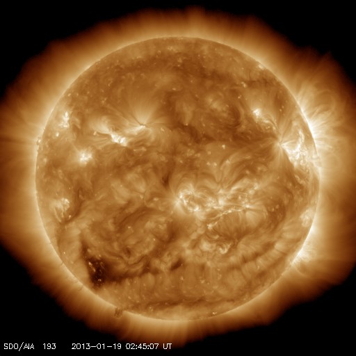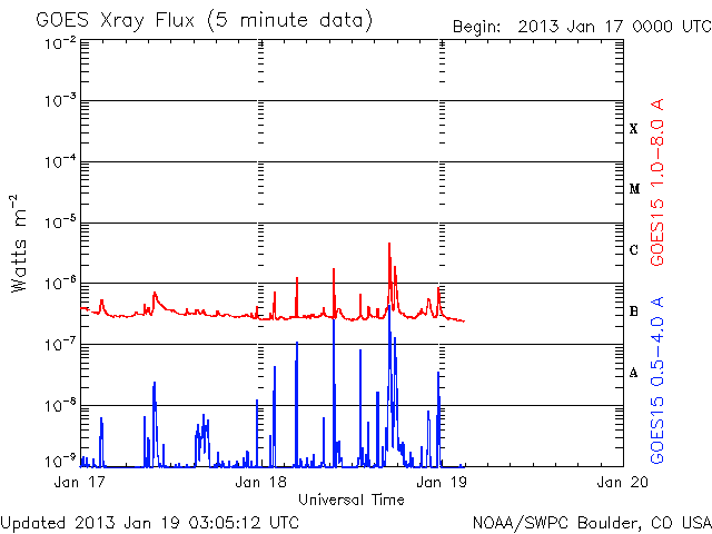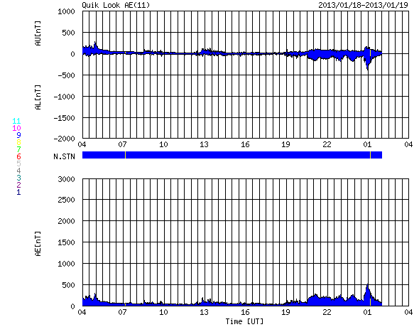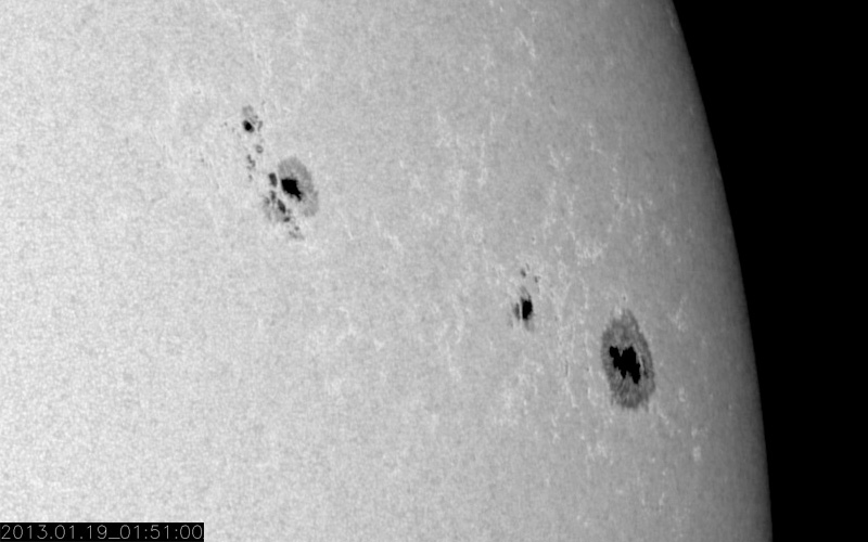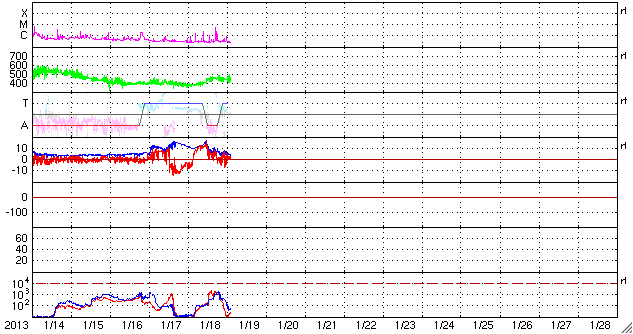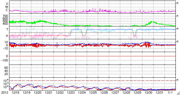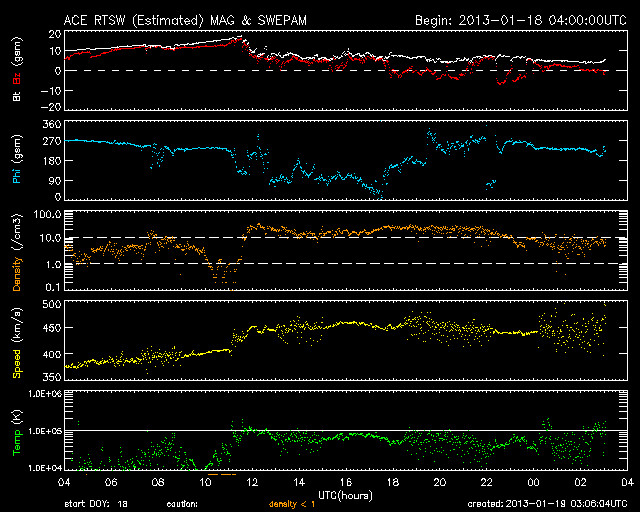 2013/ 1/19 12:07 更新 C5.8のフレアが発生しました。太陽風は450km/秒とやや高速です。 担当 篠原 この10日間ほど太陽面をにぎわせていた1654黒点群が、 いよいよ西の端に近付いています。 最後の様子を拡大写真で紹介します。 黒点の形も単純になってしまって、 東の端に登場した頃の迫力はなくなっています。 1654群は再びフレアを起こしていて、 今日未明、19日2時(世界時18日17時)のC5.8と、 その前後にC1.0、C2.3の小規模フレアを起こしています。 また太陽の北東(左上)には、小さい1659黒点群が発生しています。 X線の動画では、小さい活動を頻繁に起こしています。 今後、更に発達するようだと注目してください。 太陽風は、昨夜、18日20時(世界時18日11時)頃に、 段差の様なものが来て、 磁場強度が10nTから5nTに下がる一方、 速度は400km/秒から450km/秒に高まる変化が見られています。 半日ほど経過した現在も、太陽風は同じような状態です。 太陽風磁場の南北成分は、 昨日のニュースの直後に北向き(プラス側)に変わり、 オーロラの活動は穏やかになってしまいました。 今日に入った頃から、磁場は0nTをはさんで変化するようになり、 速度がやや高まっている影響もあるのか、 AE指数には小さな変化が見られています。 この1週間ほど見られていた太陽風の変動は、 そろそろ終わって、この後は低速の穏やかな状態になりそうです。 27日周期の図を参考にすると、1週間ほど低速の風が続き、 1月26〜27日頃に小さな変動が回帰してくるかもしれません。 この週末は大学入試のセンター試験とのことですが、 鹿児島高専でも今日は推薦入試を行っています。 中学3年生の受験生たちが教室でがんばっています。 今日の学校は、静かな中に緊張感が漂っています。 ![]() 西の端に近付いた1654黒点群。 (c) SDO (NASA) ![]() SDO衛星のAIA193カメラによる太陽コロナの様子 (c) SDO (NASA) ![]() SDO衛星による太陽の可視光写真。マウスの矢印を写真に重ねると、黒点番号付きの写真に切り替わります。 (c) SDO (NASA) ![]() GOES衛星の太陽X線データ (c) NOAA/SWPC ![]() ACEが観測した太陽風の磁場(1番上の枠、白線は全体の強度、赤線は南北成分) および、太陽風の密度(3番目の橙線)、速度(4番目の黄線) (c) NOAA/SWPC ![]() リアルタイムAE指数 下段のAEグラフの値が高くなると、オーロラ活動が活発化しています。 (c) 京都大学, NICT ![]() 27日の太陽周期に合わせたデータプロット 太陽が同じ面を地球に向けていた27日前の変化から、今後を予想することができます。 (c) 作図:宇宙天気ニュース