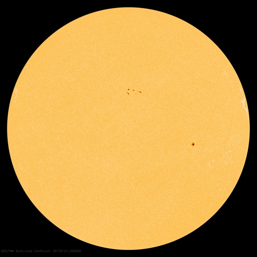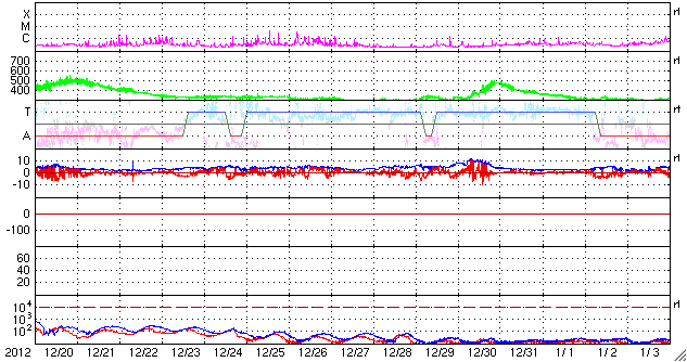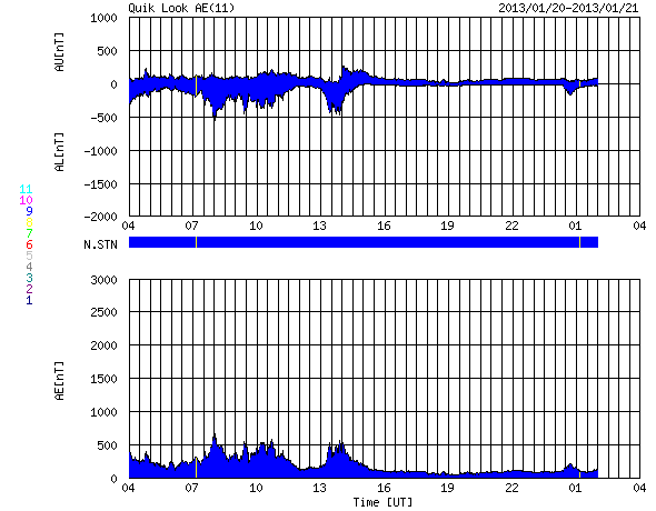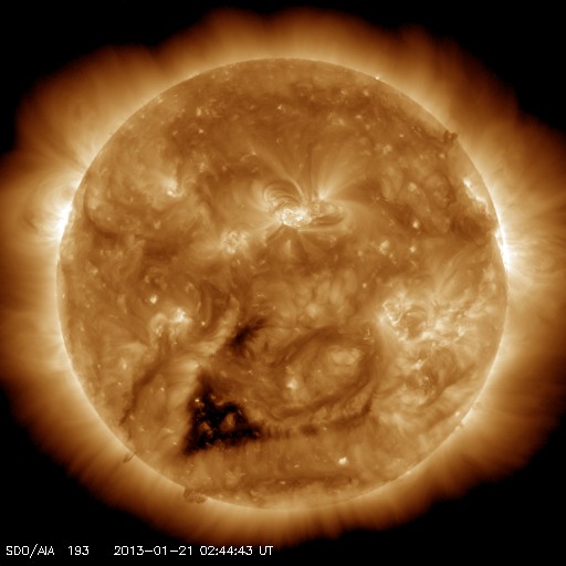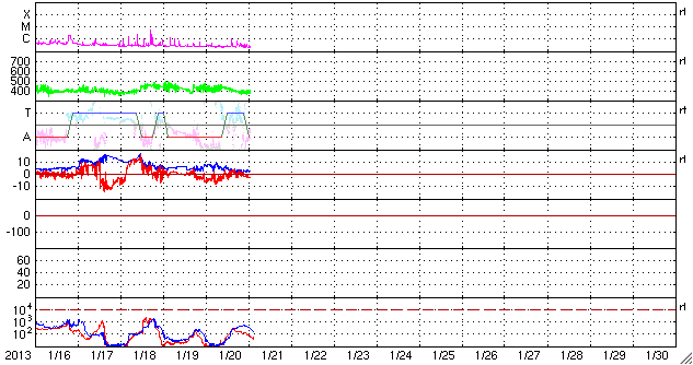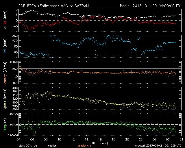 2013/ 1/21 12:14 更新 太陽風はやや低速です。太陽の南半球にコロナホールが広がっています。 担当 篠原 太陽の1654黒点群は、西の端に沈みました。 最後に、C1.1の小規模フレアを起こしています。 残った黒点群は2つで、 中央の1660黒点群はやや発達して、黒点が増えています。 太陽風は、速度が380km/秒に下がり、 やや低速の風になっています。 磁場強度も、3〜4nTとやや弱めの値です。 磁場の南北成分は、昨日の南寄りから、 一旦、北寄りに変わって、今朝から再び南寄りに戻っています。 しかし、磁場の強さが下がっているため、 南向きも-2〜-3nTと弱い振れ方です。 磁気圏の変動も、太陽風磁場の変化に合わせて、 AE指数のグラフの前半で500nT程度の活動が発生していますが、 中程から静かになっています。 現在の南向きの影響がこれから見られそうですが、 規模は小さなものに留まるでしょう。 太陽風は、低速の穏やかな状態が続くと思われます。 SDO衛星AIA193で太陽のコロナを見ると、 南半球側に大きくコロナホールの暗い領域が広がっています。 コロナホールは、太陽の磁場が外側へ向って広がっている領域で、 速度の高い太陽風が吹き出しています。 そのため、コロナの密度が減って暗く見えています。 コロナホールの先頭(右端)が太陽の中央線付近に来ているので、 3日後の24日頃から太陽風に影響が見られるかもしれません。 緯度が高めなので、どの程度の影響が到来するのか注目してください。