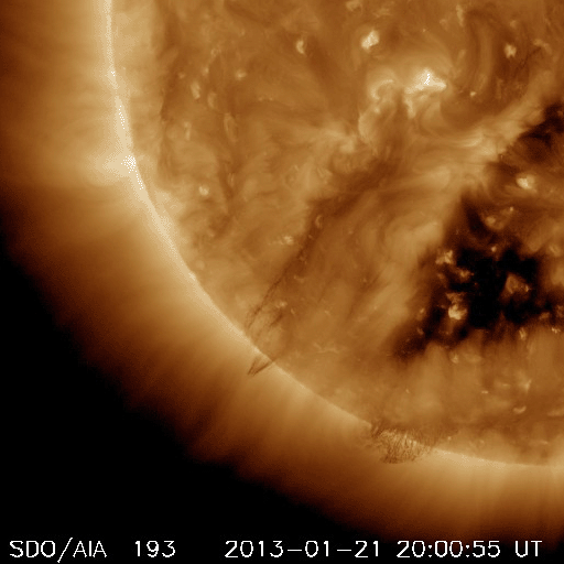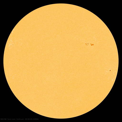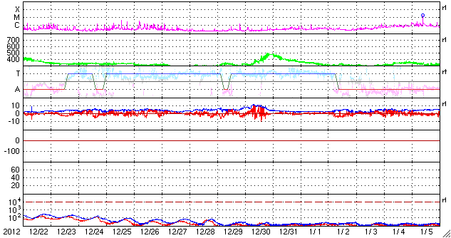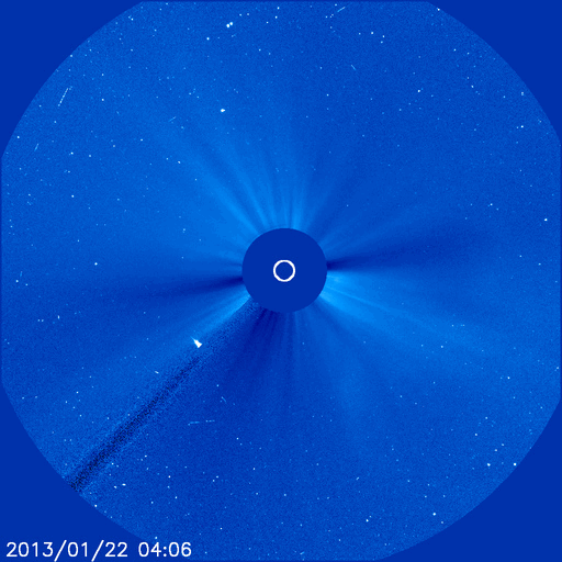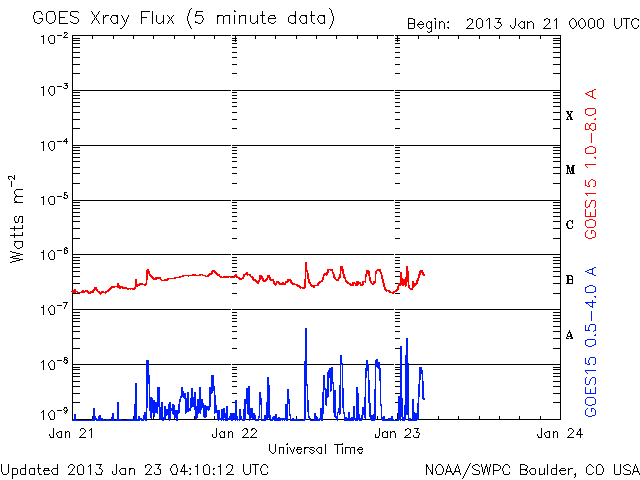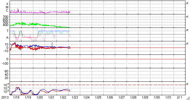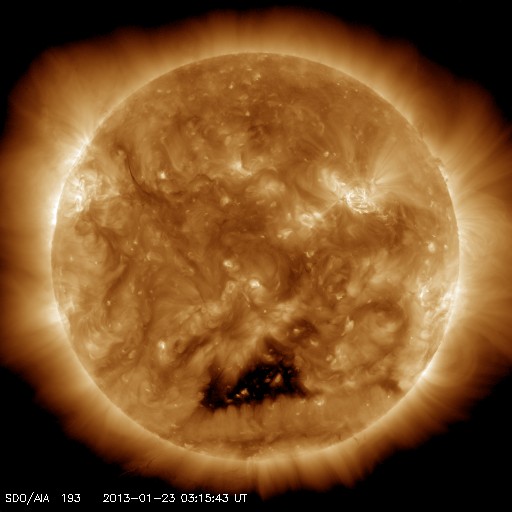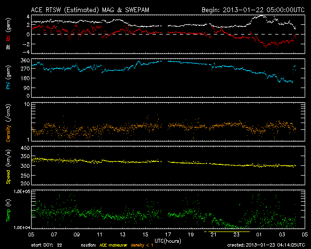2013/ 1/23 13:15 更新 フィラメントの噴出で弱いCMEが発生しています。太陽風は低速で、磁気圏も静かです。 担当 篠原 太陽の北東の端から、1661黒点群が現れました。 黒点がひとつと周囲に白斑が見える程度の小さな領域です。 また、その奥にもうひとつ別の黒点が顔を出しています。 フレアは、Bクラスの小さなフレアが1660群で発生している程度です。 1660群は目立った発達はしていません。 また、太陽の南東部でフィラメントの噴出が発生しました。 SDO衛星のAIA193とAIA304と、 SOHO衛星LASCO C3の動画を掲載します。 斜め方向の噴出なので、地球への影響はなさそうです。 太陽風は、速度が300km/秒へ下がり、更に低速の状態になっています。 磁場強度も2nTに弱まったままで、太陽風はとても穏やかです。 磁気圏も静穏で、AE指数はほとんど変化していません。 SDO衛星AIA193では、 南半球のコロナホールがちょうど太陽の中心線に来ています。 位置が南(下)方向に偏っていますが、 速度の高い太陽風が地球方向にもある程度吹き出している可能性があります。 明日か明後日くらいに太陽風の強まりが到来するかもしれません。 磁場の変化によっては、オーロラの強まりも期待できます。