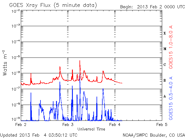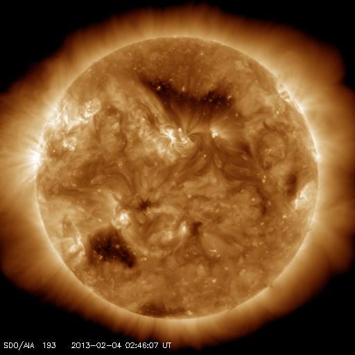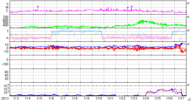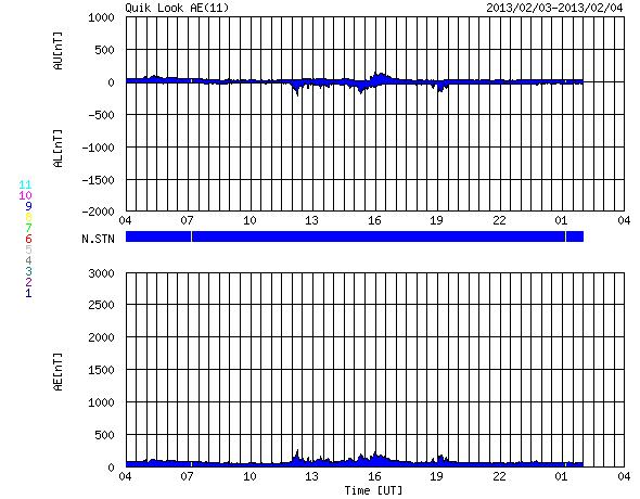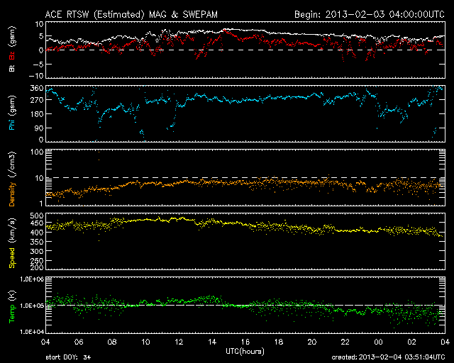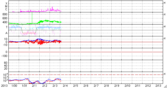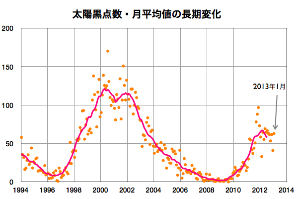 2013/ 2/ 4 12:52 更新 C8のフレアが発生しました。1月の黒点数は62.9でした。ムルマンスクのオーロラをどうぞ。 担当 篠原 SIDCより、2013年1月の黒点相対数が発表されました。 それによると、1月の平均値は62.9でした。 1月の前半は黒点群がいっぱい現れて、 黒点数が100を超えた日も6日あったのですが、 後半になるとぐっと減って、黒点数は40前後に下がり、 月の平均値としては、過去1年間の値と同等の62.9になりました。 ちなみに、黒点数が100を超えたのは2012年9月4日以来でした。 また、2012年で黒点数が100以上になったのは12日だけでした。 その太陽ですが、昨日は1667黒点群で 3日15時(世界時3日6時)にC8.4と大きめのCクラスフレアが発生しました。 1667群は、その前後にもC2.2、C1.5のフレアを起こしています。 また、中心近くの1665黒点群でもC1.5の小規模フレアが起きています。 その後、活動は落ち着いていますが、 この後ももうしばらく注目してください。 そして、ロシア・ムルマンスクの福島さんより、 2月3日にベルガン・アレクサンドル氏によって撮影されたオーロラの写真が届きました。 今回の写真は、天の川を撮影していた時に偶然オーロラが入ってきたそうです。 ほど良い明るさで、天の川とオーロラの共演となっています。 星の紹介をすると、道路の上に明るく光っているのはこと座のベガです。 そこから左上に伸ばしたところに、はくちょう座のデネブが写っています。 この2つの星が横に並ぶように沈んで行くのは、北極圏ならではの光景です。 これに、地平線の下にあるわし座のアルタイルと合わせると夏の大三角ができます。 他の星座も普段と見え方が違うので、探すのに苦労します・・・ 星図と見比べるとちょっと面白いです。 カシオペヤ座の半分やアンドロメダ大星雲も写っています。 ペガスス座も胴体だけ見えていますね。 真っ白な雪道の上に輝く夏の天の川とオーロラ。 眺めていてとても楽しい写真をありがとうございました。 太陽風は、速度は400km/秒、磁場強度は5nTと、 どちらも平均的な値です。 低速風に戻っていないので、 コロナホールの影響が届いているのかもしれません。 磁気圏は静穏で、AE指数のグラフは小さな変化が見られる程度です。 SDO衛星AIA193の太陽コロナ写真を見ると、 北半球の高緯度寄りのコロナホールが、太陽の西側に迫り出しています。 緯度が高めなので、地球への影響は弱そうですが、 27日前の写真と比べるとコロナホールは濃さを増しているので、 影響が見られるかどうか、この後のデータに注目してください。 ![]() 1994年以降の太陽黒点相対数の月平均値の変化。 (c) 黒点データ:SIDC、作図:宇宙天気ニュース ![]() ムルマンスクで夏の天の川と共に写ったオーロラ。ベルガン・アレクサンドル氏撮影。 (c) 福島留美氏、ベルガン・アレクサンドル氏 ![]() SDO衛星のAIA193カメラによる太陽コロナの様子 (c) SDO (NASA) ![]() SDO衛星による太陽の可視光写真。マウスの矢印を写真に重ねると、黒点番号付きの写真に切り替わります。 (c) SDO (NASA) ![]() GOES衛星の太陽X線データ (c) NOAA/SWPC ![]() ACEが観測した太陽風の磁場(1番上の枠、白線は全体の強度、赤線は南北成分) および、太陽風の密度(3番目の橙線)、速度(4番目の黄線) (c) NOAA/SWPC ![]() リアルタイムAE指数 下段のAEグラフの値が高くなると、オーロラ活動が活発化しています。 (c) 京都大学, NICT ![]() 27日の太陽周期に合わせたデータプロット 太陽が同じ面を地球に向けていた27日前の変化から、今後を予想することができます。 (c) 作図:宇宙天気ニュース