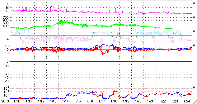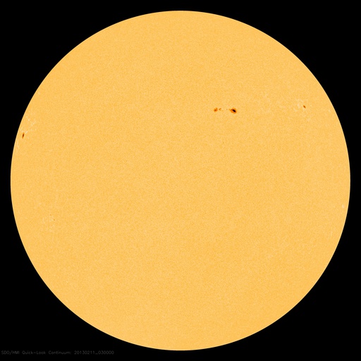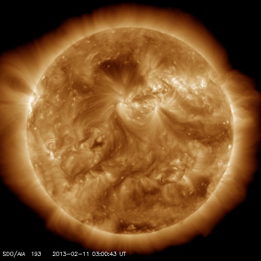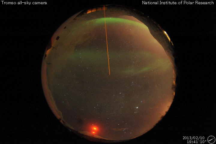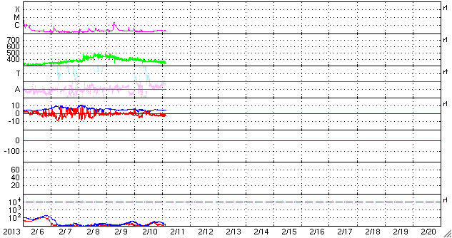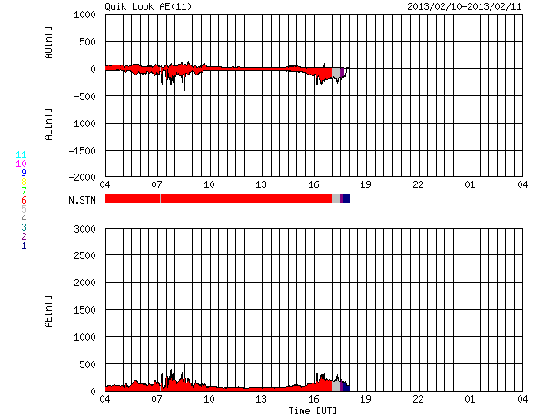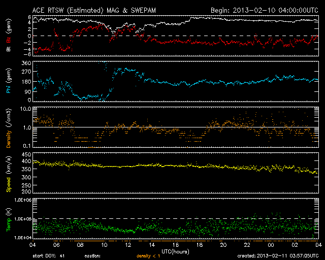 2013/ 2/11 12:58 更新 太陽風は低速になりましたが、磁場が南寄りになってオーロラの活動を起こしています。 担当 篠原 太陽風の速度は、昨日のニュース以降もゆっくりと下がり、 340km/秒と低速風に変わっています。 27日周期の図で前周期の変化と比較すると、 1月13〜15日頃に見られていた太陽風の強まりは、 2月7〜9日と少し前に移動して、 磁場の変化はより大きくなったものの、速度の高まりは小さくなっています。 また、今回は太陽の南半球にコロナホールが現われていましたが、 太陽風の変化のタイミングから考えると、直接影響はなかった様です。 次の27日後にあたる、3月7〜10日頃はどのような太陽風がやって来るでしょうか。 太陽風の磁場強度は、5nT前後と平均的な強さが続いています。 南北成分は昨日のニュースの後から南寄りになっていて、 -2〜-4nTの弱い南向きが長い時間続いています。 この影響で、オーロラの活動度を表すAE指数は、 300nTほどの小さな変化が発生しています。 ただし、今日のAE指数は観測データが少なく、 後半はまだデータが来ていません。 そのAE指数の欠けている時間帯にあたりますが、 世界時10日20時頃にノルウェーのトロムソで きれいなオーロラが撮影されています。 動画を掲載します。 低速の太陽風はこの後も続きそうです。 磁場の南寄りが弱まると、オーロラも静かになって行きます。 太陽は、フレア活動も見られず静かです。 太陽の南東に小さな黒点が新しく現われ、 北東の端からは新しい黒点がこちら側に姿を現しました。 しかし、今のところ活動は特に見られません。