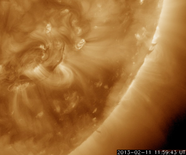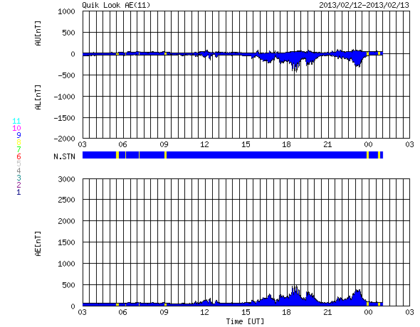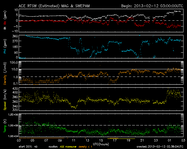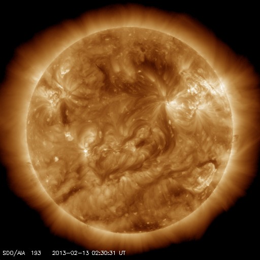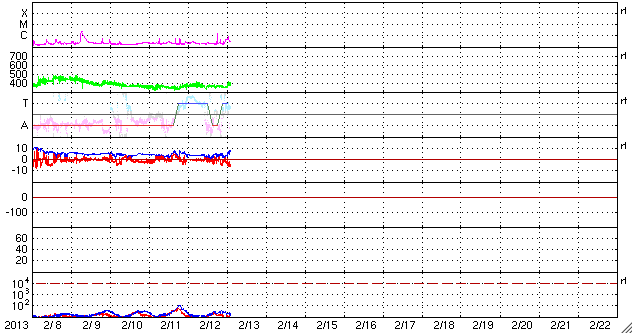 2013/ 2/13 11:39 更新 太陽の南西でフィラメント噴出が発生しました。太陽風磁場が南向きに振れ、オーロラを強めそうです。 担当 篠原 太陽の南西部でフィラメントの噴出が発生しました。 SDO衛星AIA193の太陽全体写真の右下に、 爆発による明るい領域が見えています。 拡大写真による動画を掲載します。 爆発する様子もきれいですが、 黒い筋の様に見えるフィラメントが、 ゴムひものようにびよんびよん弾んでいる様子が面白いです。 このフィラメント噴出によって、 CME(太陽ガスの放出現象)が発生している可能性がありますが、 まだSOHO衛星などのデータを見ることができません。 地球からは斜め方向に噴き出しているので、影響はないでしょう。 また、1670黒点群でC1.5の小規模フレアが発生していますが、 太陽全体の活動は穏やかです。 太陽風は、昨日のニュース以降も 速度は370km/秒、磁場強度は4nTと低速の穏やかな状態が続いていました。 そして、今朝、13日10時(世界時13日1時)に小さな変化が到来して、 速度は400km/秒、磁場強度は8nTへそれぞれ小幅ですが高まっています。 大きな変化に繋がることはないでしょうが、 この後の変化に注目してください。 この変化の頃から、磁場の南北成分が -5nTと南向きにやや強まっています。 これから、オーロラの活動度が高まる可能性があります。 AE指数のグラフでも、図の後半から250nT程度の小さな変化が始まっています。 今後はもう少し規模の大きな活動になりそうです。 ![]() SDO衛星AIA193カメラによる、太陽の南西部で発生したフィラメントの噴出。 (c) SDO (NASA)、 (動画加工 : 宇宙天気ニュース) ![]() SDO衛星のAIA193カメラによる太陽コロナの様子 (c) SDO (NASA) ![]() SDO衛星による太陽の可視光写真。マウスの矢印を写真に重ねると、黒点番号付きの写真に切り替わります。 (c) SDO (NASA) ![]() GOES衛星の太陽X線データ (c) NOAA/SWPC ![]() ACEが観測した太陽風の磁場(1番上の枠、白線は全体の強度、赤線は南北成分) および、太陽風の密度(3番目の橙線)、速度(4番目の黄線) (c) NOAA/SWPC ![]() リアルタイムAE指数 下段のAEグラフの値が高くなると、オーロラ活動が活発化しています。 (c) 京都大学, NICT ![]() 27日の太陽周期に合わせたデータプロット 太陽が同じ面を地球に向けていた27日前の変化から、今後を予想することができます。 (c) 作図:宇宙天気ニュース