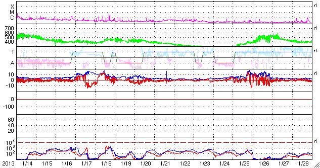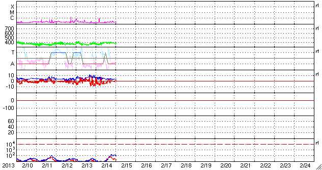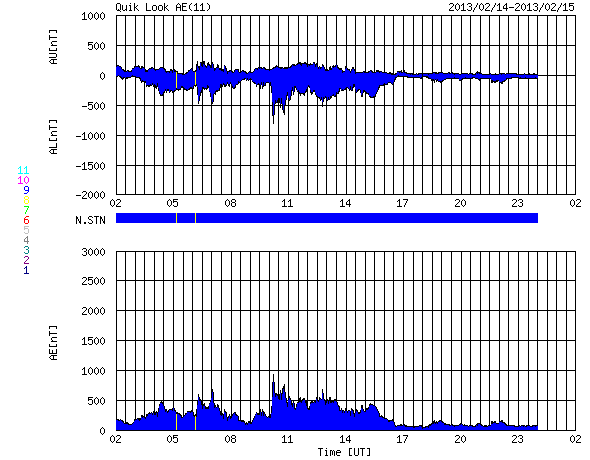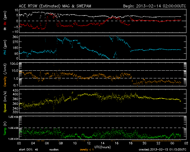 2013/ 2/15 10:16 更新 太陽風磁場の南向きが続き、オーロラの活動も続きました。海の上からのオーロラ写真をどうぞ。 担当 篠原 北欧を旅行中の吉田武史さんより、 昨日のニュースで紹介した全天カメラの動画と同じ時間帯に撮影された オーロラの写真をいただきました。 吉田さんは、フッティルーテンという沿岸急行船に乗って、 ノルウェーの北の果てから南のベルゲンへ向かっている途中で、 トロムソから2時間半ほどの海の上でこのオーロラを撮影されたとのことです。 このニュースでも連日トロムソの全天カメラのオーロラを紹介していましたが、 吉田さんは3日連続でオーロラを楽しむことができているそうです。 船のWiFiを使って撮りたての写真をメールしてくださったとのことで、 沿岸急行船の便利さに驚いています。 海の上からの珍しいオーロラの写真をどうもありがとうございます。 こんな景色を眺めながら旅をしてみたいです。 現在の太陽風は、 380km/秒と少し速度が上がって、やや低速の状態です。 磁場強度は、6nTから4nTへ下がり、平均よりやや弱めです。 磁場の南北成分は、世界時14日14時くらいまで 南向きの-5nTくらいに振れていました。 その影響で、AE指数もこの頃まで500nT前後の変化がずっと続いています。 昨夜はアラスカのライブカメラで、 ずっとオーロラの輝きを眺めることができました。 しかし、その後磁場の南北成分は0nT付近に下がりました。 それとともにAE指数の変化は小さくなり、オーロラの活動は弱まった様です。 太陽風は、現在の様な穏やかな状態がしばらく続きそうです。 太陽では、西の端に近付いた1670黒点群で、 C1.0の小規模フレアが発生しました。 目立った活動はその程度で、太陽は穏やかです。