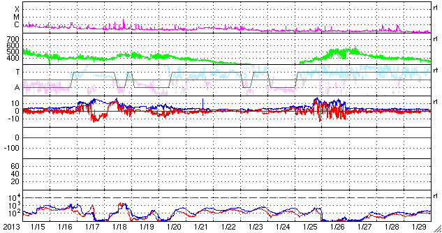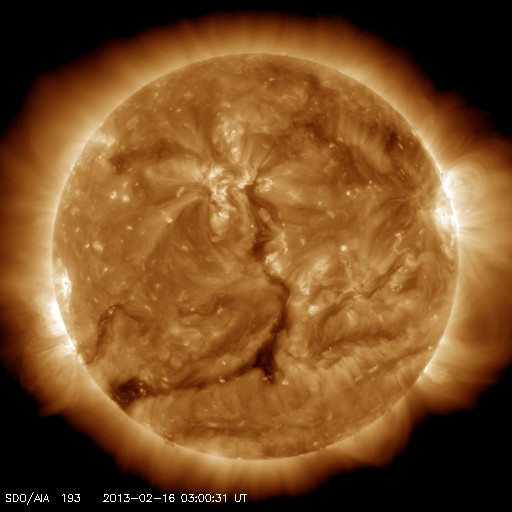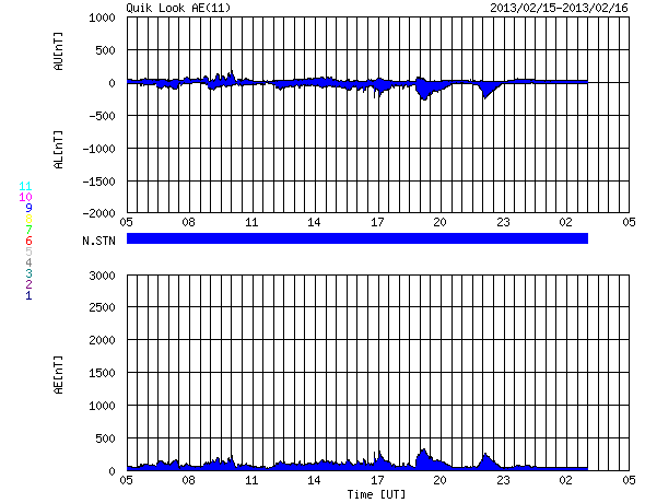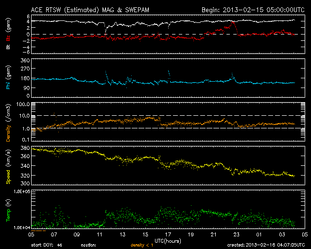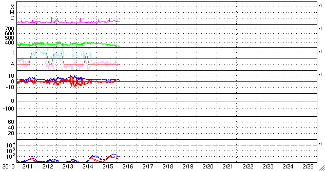 2013/ 2/16 13:07 更新 太陽風の速度は320km/秒と低速です。昨日に続くノルウェーのオーロラ写真をどうぞ。 担当 篠原 ノルウェーをフッティルーテンという沿岸急行船で旅行中の吉田さんより、 昨日に続いてオーロラの写真が届きました。 今日の写真は世界時14日20時半、 ノルウェー北部から角の様に細長く延びているロフォーテン諸島にある 港町スタムスン(Stamsund)に停泊中の撮影とのことです。 切り立ったフィヨルドの壁とオーロラの共演です。 北の空を覆うように巨大なオーロラが出現したそうですが、 勢いは5〜6分ほどで弱まったとのことで、 短いチャンスを逃さず捉えるのはたいへんだったのではないでしょうか。 荒々しい岩肌が印象的です。 今日も撮りたてのオーロラ写真をどうもありがとうございます。 素敵なオーロラの写真から始まりましたが、 現在の太陽風は更に速度が下がって、320km/秒とかなり遅くなっています。 磁場強度は4nTとやや弱めで、南北成分は0nT付近を推移しています。 AE指数のグラフは、100〜200nTの小さな変化が頻繁に発生しています。 磁気圏では、小さな活動が続いている様です。 SDO衛星AIA193の太陽コロナ写真を見ると、 太陽の南東(左下)から細長いコロナホールが、 くねくねと曲がりながら太陽の中心まで伸びています。 前周期(27日前)は、南東部にひとかたまりの様にあったのですが、 今回は亀裂のような面白い形に変わりました。 地球へ到来する太陽風に影響が見られるのかどうか、 3日後くらいの様子に注目してください。 太陽は、南東の端から1673黒点群が現れました。 この他にも、1672群、1674群と2つの黒点群が出現して、 番号が付けられているのですが、 どちらも規模が小さく、掲載の写真では既に見えなくなっています。 フレアは、Bクラスの小さな変化が起きている程度です。 新しい1673黒点群の活動はどの程度でしょうか。