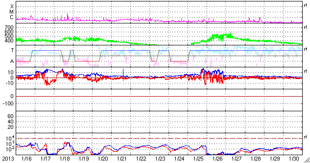 (c) SDO (NASA) ![]() SDO衛星による太陽の可視光写真。マウスの矢印を写真に重ねると、黒点番号付きの写真に切り替わります。 (c) SDO (NASA) ![]() ACEが観測した太陽風の磁場(1番上の枠、白線は全体の強度、赤線は南北成分) および、太陽風の密度(3番目の橙線)、速度(4番目の黄線) (c) NOAA/SWPC ![]() リアルタイムAE指数 下段のAEグラフの値が高くなると、オーロラ活動が活発化しています。 (c) 京都大学, NICT ![]() 27日の太陽周期に合わせたデータプロット 太陽が同じ面を地球に向けていた27日前の変化から、今後を予想することができます。 (c) 作図:宇宙天気ニュース