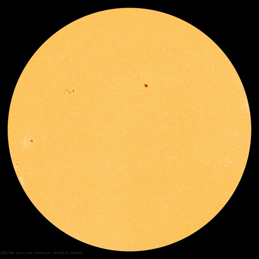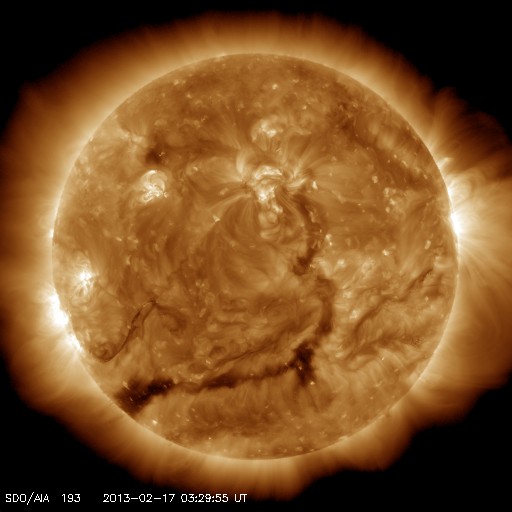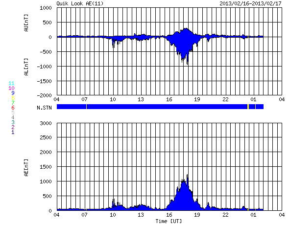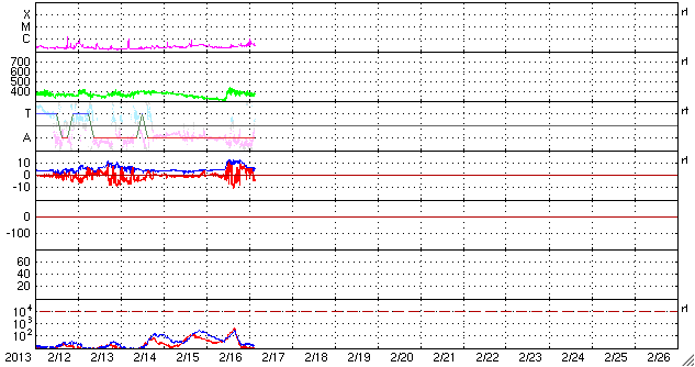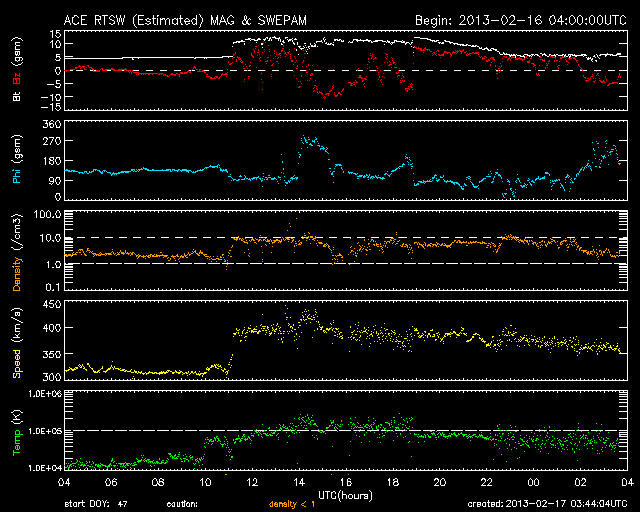 2013/ 2/17 12:46 更新 太陽風の一時的な乱れが到来しました。太陽に新しい黒点群が現れています。 担当 篠原 ACE衛星の観測によると、 昨夜、16日20時(世界時16日11時)に、小規模の衝撃波が到来し。 太陽風の磁場強度が5nTから10nTへ、 プラズマの密度は1個/cm^3から10個/cm^3へ、 速度は320km/秒から400km/秒へそれぞれ急に強まりました。 速度は平均レベルに上がった程度で、 27日周期の図を見るとよく分かりますが、 太陽風の乱れとしては比較的小さな規模でした。 13日のニュースで紹介したフィラメント噴出 によって発生したCMEの影響かもしれません。 (CMEの動画は14日のニュースで紹介しています) 到来から半日ほど経った現在は、 磁場強度は5nT、プラズマ密度は2個/cm^3と既に元の状態に戻り、 速度も350km/秒と低速の風に下がっています。 太陽風の乱れは一段落となりそうです。 太陽風の擾乱によって磁場が強まった後、 一時的に磁場の南北成分が-10nTと強く南を向きました。 この影響で、AE指数のグラフには1000nTに達する 大きな変化が記録されています。 一時的に磁気圏の活動が高まった様です。 その後、太陽風の磁場は北向きに変わって、 磁気圏は静かになりました。 そして、現在の太陽風は、 2時間ほど前から-5nT程度の南寄りに振れています。 この傾向が続くなら、オーロラの活動度もある程度高まりそうです。 太陽は、フレアの発生はありませんが、 北東に1675黒点群が新しく発生し、 南東の端から1676黒点群が出現しました。 1676群の南にももう一つ群がある様で、 太陽の活動が少しにぎわうかもしれません。