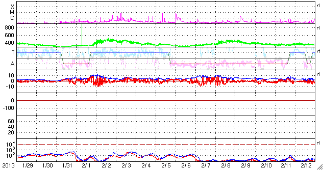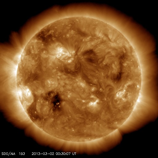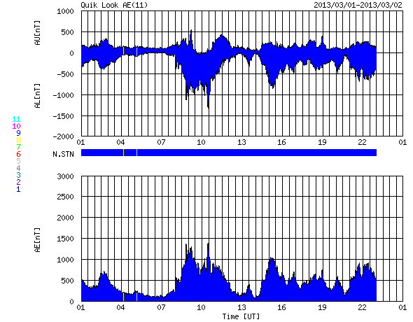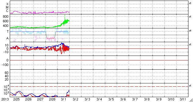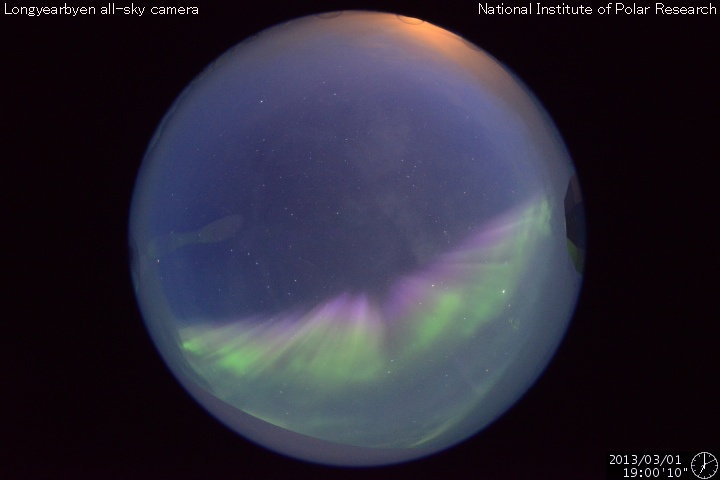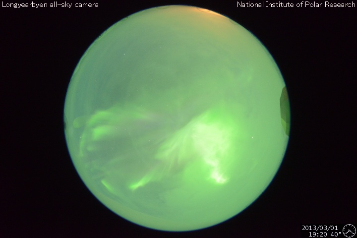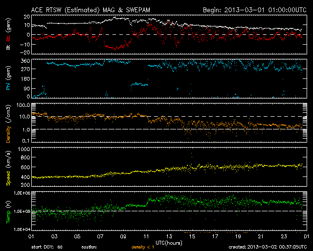 2013/ 3/ 2 09:38 更新 600km/秒を超える高速の太陽風が到来しました。磁気圏の活動も活発化しています。 担当 篠原 高速の太陽風が到来しました。 太陽風の速度は、昨日の昼過ぎからゆっくりと上昇を始めました。 そして、半日ほどかけて600km/秒を超え、現在は620km/秒です。 太陽風の速度がしっかりと600km/秒を超えたのはかなり久しぶりで、 昨年の8月27日以来、半年ぶりの様です。 (600km/秒ぎりぎりという条件でも、10月18日以来です) 27日周期の図を見ると、高速風は前周期と同じタイミングで到来しています。 しかし、速度の高まりはより大きくなっています。 速度上昇に先立って、太陽風の磁場強度も強まりました。 昨日のニュースの後に10nTを超える様になり、 夕方には15nTくらいまで強まりました。 それとともに、磁場の南北成分が南北に大きく振れるようになり、 1日17時(世界時1日8時)には、-15nTに達する強い南向きが発生しています。 このため、磁気圏の活動は激しくなり、 AE指数は500nTを超える変化が連続的に発生し、 変化の最高は1300nTに達しています。 極域ではにぎやかなオーロラの活動が見られたのではないかと思います。 ノルウェー・スバールバル島の全天カメラの写真を2枚紹介します。 SDO衛星AIA193ではコロナホールは東西に広がりを持っていました。 速度が高まっていることもあり、 今回の高速風は前周期よりも長く続く可能性があります。 太陽は、南東の1683黒点群の向こう側から、 別の黒点群が顔を出しています。 GOES衛星のX線グラフには目立った変化はなく、太陽の活動は静かです。 昨日、インドネシア第2の都市スラバヤに移動しました。 一部しか見ていないのですが、ジョグジャカルタと比べるとより都会です。 今日はこちらの大学を訪問して、今夜の飛行機で帰国します。 明日の更新は成田空港からになりそうです。