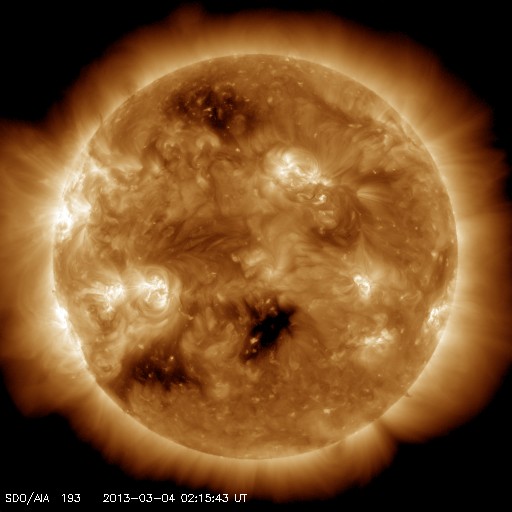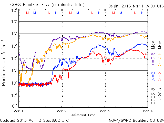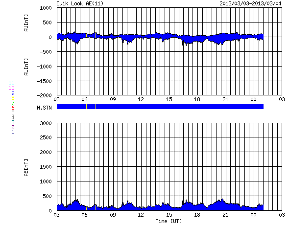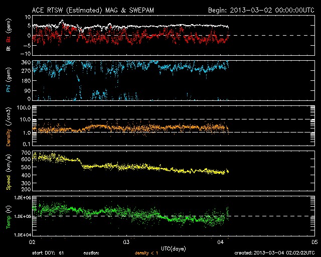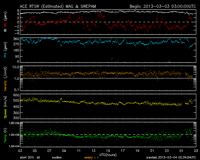 2013/ 3/ 4 11:32 更新 太陽風は450km/秒とやや高速です。オーロラの活動は続いています。 担当 篠原 昨日は宇宙天気ニュースのページにアクセスできず、 申し訳ありませんでした。 太陽風の速度は、昨日は500km/秒、昨夜より450km/秒と 高速からやや高速へと下がり気味に推移しています。 磁場強度は4nTとやや弱めの値で安定しています。 南北成分は、0nT付近から比較的南寄り(マイナス方向)に振れていて、 このため、磁気圏の活動も連続的に発生しています。 AE指数は、昨日の昼頃までは500nTと中規模の、 その後は300nTと小規模の変化が続いています 極域ではオーロラの活動が続いているようです。 国立極地研究所のノルウェーの全天カメラでも きれいなオーロラの写真を見ることができます。 高速の太陽風は、この辺りで一旦終わりそうです。 そして、SDO衛星AIA193の太陽の南半球側に見えている コロナホールの影響が明後日くらいに到来しそうです。 引き続き、オーロラの活動が高まりそうです。 放射線帯の高エネルギー電子は、 今日のグラフでもGOES15(青線)は10,000を超えています。 次の太陽風の乱れが到来しそうな明後日くらいまで このまま高い状態が続く可能性があります。 太陽は、特にフレアの活動はなく穏やかです。 東の端の南北両半球から小さい黒点が姿を現しています。