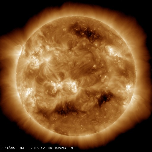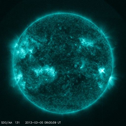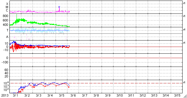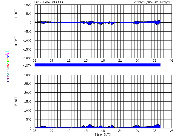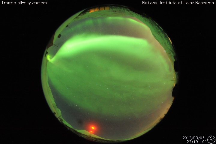 2013/ 3/ 6 14:14 更新 M1.2の中規模フレアが発生しました。太陽風はかなり低速です。 担当 篠原 昨日の夕方、5日17時(世界時5日8時)に、 太陽の西側の1686黒点群でM1.2の中規模フレアが発生しました。 SDO衛星AIA131の写真を掲載します。 右端の少し手前で明るく十字に光っている部分です。 フレア活動は、この後はC1の小さな現象が発生した程度で、 活動度が特に上がった様子はありません。 1686群も、もうしばらくすると西の端に没していきます。 太陽風は、更に速度が下がり続け、 320km/秒とだいぶ遅い風になっています。 磁場強度も3nT前後と弱めになっています。 磁場の南北成分は、グラフの前半は北寄り、 後半は南寄りになっています。 このため、オーロラの活動度が上がっているようで、 トロムソの全天カメラできれいなオーロラの写真が撮影されていました。 ただし、磁場の振幅は-2nTと小さく、太陽風の速度も遅いため、 磁気圏の変化の規模は小さいようで、 AE指数の変化は200nT程度に留まっています。 SDO衛星のAIA193では、コロナホールが西に進み、 そろそろ地球へ影響が到来するかもしれません。 これからしばらく、太陽風の変化に注目して下さい。 放射線帯の高エネルギー電子は、今日も10,000に達し、 高い状態が続いています。 しかし、磁気圏の活動が少し強まったので、 明日はある程度減少しそうです。 インドネシアから帰った後、研究集会のため福岡に滞在しています。 今夜鹿児島に戻って、明日は久しぶりに鹿児島高専から更新する予定です。 ![]() SDO衛星AIA131による、太陽の西側で発生したM1.2フレア。 (c) SDO (NASA) ![]() ノルウェー・トロムソの全天カメラで撮影されたオーロラ。 (c) 国立極地研究所 ![]() SDO衛星のAIA193カメラによる太陽コロナの様子 (c) SDO (NASA) ![]() SDO衛星による太陽の可視光写真。マウスの矢印を写真に重ねると、黒点番号付きの写真に切り替わります。 (c) SDO (NASA) ![]() GOES衛星の太陽X線データ (c) NOAA/SWPC ![]() ACEが観測した太陽風の磁場(1番上の枠、白線は全体の強度、赤線は南北成分) および、太陽風の密度(3番目の橙線)、速度(4番目の黄線) (c) NOAA/SWPC ![]() リアルタイムAE指数 下段のAEグラフの値が高くなると、オーロラ活動が活発化しています。 (c) 京都大学, NICT ![]() 27日の太陽周期に合わせたデータプロット 太陽が同じ面を地球に向けていた27日前の変化から、今後を予想することができます。 (c) 作図:宇宙天気ニュース