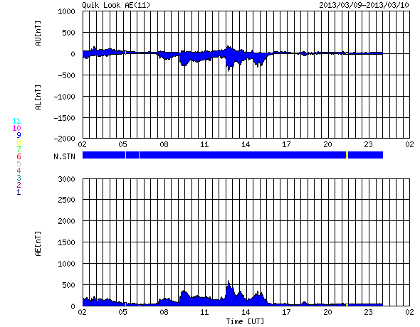 下段のAEグラフの値が高くなると、オーロラ活動が活発化しています。