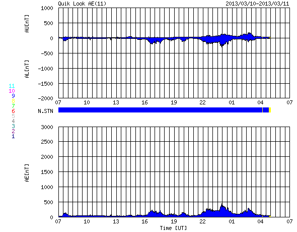 下段のAEグラフの値が高くなると、オーロラ活動が活発化しています。