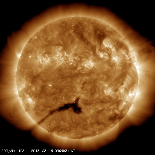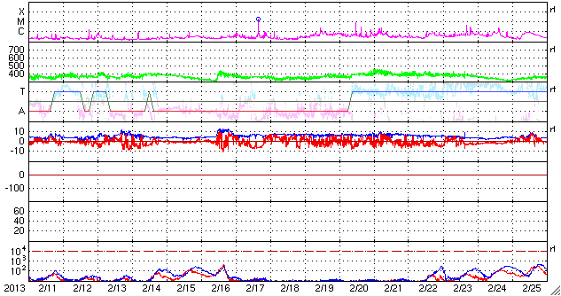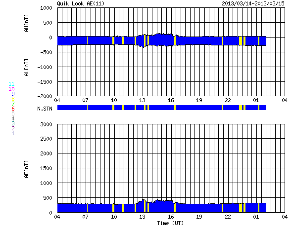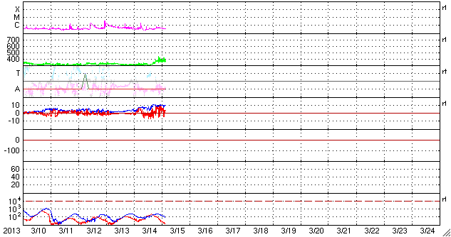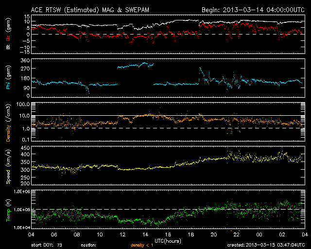 2013/ 3/15 12:48 更新 太陽風の速度が少し上がりました。アラスカのオーロラ写真と、パンスターズ彗星の写真をどうぞ。 担当 篠原 アラスカの今野さんより、撮りたてのオーロラの写真をいただきました。 オーロラの光の帯が、空をまたぐように躍動する姿をご覧ください。 特に3枚目は見事ですね。 大きいサイズで送って頂いたので、そのままの大きさで掲載しています。 ページから飛び出た感じになってしまいますが、 大画面の迫力をお楽しみ下さい。 素晴らしい写真をどうもありがとうございます。 また、昨日は午後から晴れてきたので、霧島山に出かけて、 パンスターズ彗星の観望に挑戦しました。 ただし、夕暮れになって雲が西の空にかかるようになり、 日没後に雲は薄くなったものの、少し残った状態での観望でした。 空の条件がやや悪かったこともあり、 暗くなった頃に、双眼鏡で見つけることができました。 その時に撮影した写真を2枚掲載します。 たいした写真ではありませんが、雰囲気だけでもご覧ください。 パンスターズ彗星は日を追う毎に暗くなって行きます。 この週末にかけて、晴天であれば双眼鏡を用意して 挑戦してはいかがでしょうか(国立天文台の観望ガイド)。 現在の宇宙天気ですが、太陽風は、 昨夜から磁場強度が10nTに上がり、 その後、速度も上昇して370km/秒とやや低速くらいに高まっています。 CMEの到来はまだなので、コロナホールによる変化でしょうか。 磁場の南北成分は、0nT付近から北寄りに推移しています。 このため、磁気圏は比較的穏やかな状態が続いている様です。 AE指数はデータエラーのため、グラフがおかしくなっています。 太陽風の磁場強度は、現在も強まったままです。 今後もう一段速度の上昇があるのか、この状態で落ち着くのか、 しばらく注目してください。 太陽は、北半球を東西に黒点が並んでいて、なかなかにぎやかです。 フレアは、1691黒点群でC2.1の小規模フレアが発生した程度です。 ![]() アラスカの今野さんにより撮影されたオーロラ。 (c) ミチ 今野氏 ![]() アラスカの今野さんにより撮影されたオーロラ。 (c) ミチ 今野氏 ![]() アラスカの今野さんにより撮影されたオーロラ。 (c) ミチ 今野氏 ![]() 夕暮れの低空に現われたパンスターズ彗星。霧島より。 (c) 宇宙天気ニュース ![]() 夕暮れの低空に現われたパンスターズ彗星。霧島より。 (c) 宇宙天気ニュース ![]() SDO衛星のAIA193カメラによる太陽コロナの様子 (c) SDO (NASA) ![]() SDO衛星による太陽の可視光写真。マウスの矢印を写真に重ねると、黒点番号付きの写真に切り替わります。 (c) SDO (NASA) ![]() ACEが観測した太陽風の磁場(1番上の枠、白線は全体の強度、赤線は南北成分) および、太陽風の密度(3番目の橙線)、速度(4番目の黄線) (c) NOAA/SWPC ![]() リアルタイムAE指数 下段のAEグラフの値が高くなると、オーロラ活動が活発化しています。 (c) 京都大学, NICT ![]() 27日の太陽周期に合わせたデータプロット 太陽が同じ面を地球に向けていた27日前の変化から、今後を予想することができます。 (c) 作図:宇宙天気ニュース