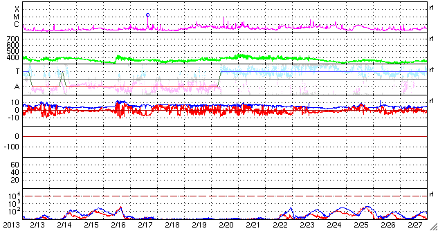 (c) SOHO (ESA & NASA)、(動画加工 : 宇宙天気ニュース ) ![]() STEREO Behind衛星のHI1カメラを通過するパンスターズ彗星と地球(右の明るい星)。 (c) STEREO (NASA)、 (動画加工 : 宇宙天気ニュース) ![]() SDO衛星のAIA193カメラによる太陽コロナの様子 (c) SDO (NASA) ![]() SDO衛星による太陽の可視光写真。マウスの矢印を写真に重ねると、黒点番号付きの写真に切り替わります。 (c) SDO (NASA) ![]() GOES衛星の太陽X線データ (c) NOAA/SWPC ![]() ACEが観測した太陽風の磁場(1番上の枠、白線は全体の強度、赤線は南北成分) および、太陽風の密度(3番目の橙線)、速度(4番目の黄線) (c) NOAA/SWPC ![]() リアルタイムAE指数 下段のAEグラフの値が高くなると、オーロラ活動が活発化しています。 (c) 京都大学, NICT ![]() 27日の太陽周期に合わせたデータプロット 太陽が同じ面を地球に向けていた27日前の変化から、今後を予想することができます。 (c) 作図:宇宙天気ニュース