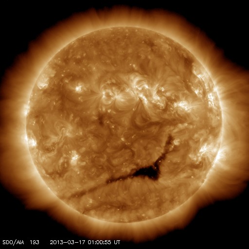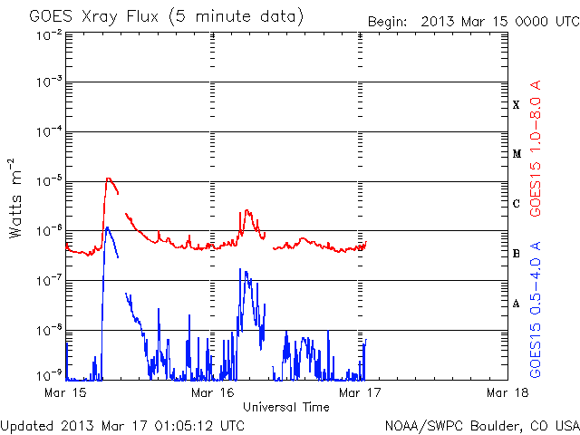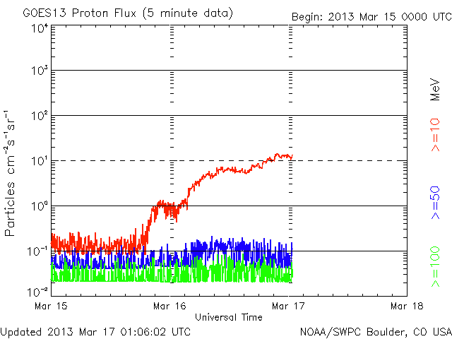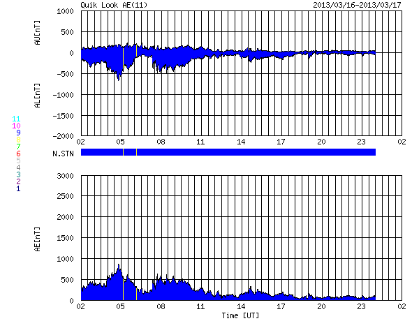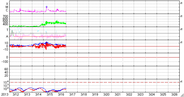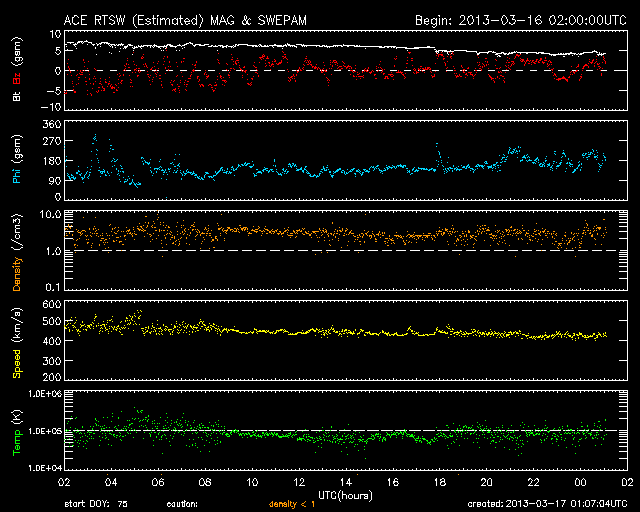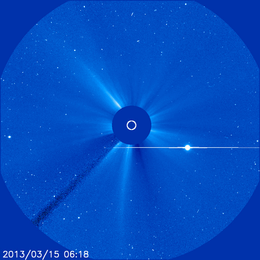 2013/ 3/17 10:08 更新 15日のCMEによる太陽風擾乱の到来が近付いています。パンスターズ彗星の様子もどうぞ。 担当 篠原 昨日お知らせした、15日15時(世界時15日6時)のM1.1フレア に伴って発生したCME(太陽ガスの放出現象)の動画を改めて掲載します。 SOHO衛星LASCO C3による撮影です。 このCMEによる太陽風の乱れは、 3日くらいで地球に到来するのではないかと書きましたが、 NOAAなどの予報では2日程度で地球に達する可能性があるそうです。 すると、今日の午後にでも到来する可能性があります。 地球への到来が早いということは、 それだけ太陽風の乱れも激しいということになるので、 より一層注意が必要になります。 太陽風中の磁場が強まって、大きく南向きに振れると、 速度の高まりと重なって、 激しい磁気圏擾乱をもたらす可能性があります。 今後のACE衛星の太陽風データに注目してください。 太陽では、南西(右下)の1698黒点群で C2程度のフレアが4回発生しています。 太陽面には黒点も目立っていて、 この後もC、Mクラスのフレアが発生するかもしれません。 太陽風は、速度が450km/秒から430km/秒に少し下がり、 磁場強度も6nTから5nTに少し下がっています。 どちらも値としては平均的な状態です。 太陽風磁場の南北成分は、昨日のニュースの後に南寄りになって、 -5nT近い南向きに頻繁に振れ続けました。 そのため、磁気圏のオーロラ活動が高まり、 AE指数で500nT前後の変化が半日程度発生しています。 太陽風は、この後、CMEによる乱れが到来すると考えられます。 磁気圏活動の高まりとともに、注目してください。 GOES衛星の観測によると、M1.1フレアに関係して、 太陽放射線(非常に高速の陽子の流れ)が10程度に増加しています。 特に大きな変化ではありませんが、 この程度に高まるのは3ヶ月ぶりです。 パンスターズ彗星は、 STEREO Behind衛星HI1カメラの画面を縦に通り過ぎて、 見えるのは尾だけになってしまいました。 この動きは、地球から見ると北の方向に向かっていることになり、 夕暮れの西の空で彗星を探すと、 次第に北にずれて見えることになります。