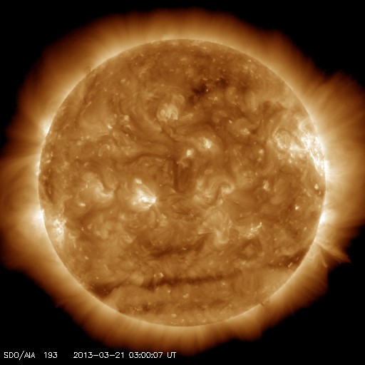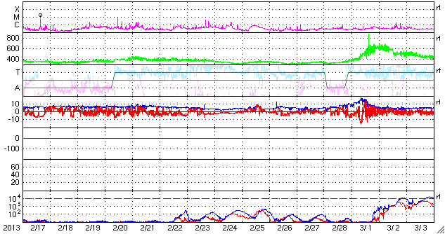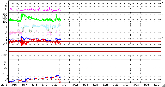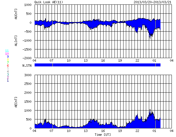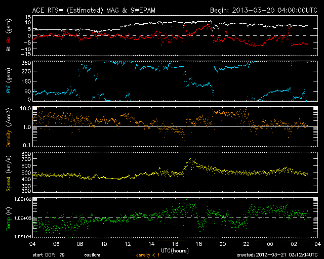 2013/ 3/21 12:13 更新 太陽風は500km/秒と高速で、磁場が南向きに振れてオーロラの活動も強まっています。 担当 篠原 STEREO Behind衛星のHI1カメラに見えていたパンスターズ彗星は、 画面を上に通り過ぎて行きました。 高画質の写真が公開されていたので、 改めて通過の様子を動画で紹介します。 動画後半の、彗星の尾の広がる様子がとてもきれいです。 太陽風の速度は、一時、400km/秒近くまで下がりましたが、 21日2時(世界時20日17時)に650km/秒へ上がり、 以降、500km/秒と高速の状態が続いています。 磁場強度は、速度上昇のしばらく前から10nTに強まり、 その後7nTほどに少し下がっています。 磁場の南北成分は、 昨日のニュース以降、0nT付近を推移していましたが、 速度が高まった後に、南寄りに振れるようになり、 -7nTとまとまった南向きの状態が発生しています。 速度が高速になっていることもあって、 磁気圏の活動度は高まり、AE指数のグラフでは、 800nTに達する中規模の変動が発生しています。 昭和基地の全天カメラでも、オーロラの活動が撮影されています。 太陽風は、昨日お知らせしたCMEによる乱れも到来するかもしれません。 引き続き、磁気圏は活動的な状態が続く可能性があります。 太陽は、昨日の朝のC5.5以降は、 西の端の1692黒点群でC1の小さなフレアが2回発生した程度です。 目立った黒点群は西の端に近付き、 こちら側の面は、活動的な領域は少なくなっています。 GOES衛星のX線写真も、全体的に暗く見えるようになってきました。 ![]() STEREO Behind衛星のHI1カメラを通過するパンスターズ彗星。 (c) STEREO (NASA)、 (動画加工 : 宇宙天気ニュース) ![]() SDO衛星のAIA193カメラによる太陽コロナの様子 (c) SDO (NASA) ![]() SDO衛星による太陽の可視光写真。マウスの矢印を写真に重ねると、黒点番号付きの写真に切り替わります。 (c) SDO (NASA) ![]() ACEが観測した太陽風の磁場(1番上の枠、白線は全体の強度、赤線は南北成分) および、太陽風の密度(3番目の橙線)、速度(4番目の黄線) (c) NOAA/SWPC ![]() リアルタイムAE指数 下段のAEグラフの値が高くなると、オーロラ活動が活発化しています。 (c) 京都大学, NICT ![]() 27日の太陽周期に合わせたデータプロット 太陽が同じ面を地球に向けていた27日前の変化から、今後を予想することができます。 (c) 作図:宇宙天気ニュース
