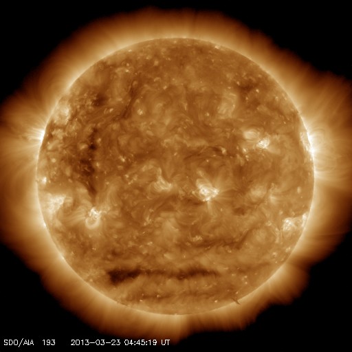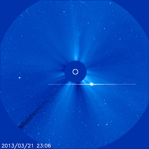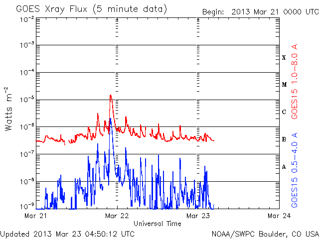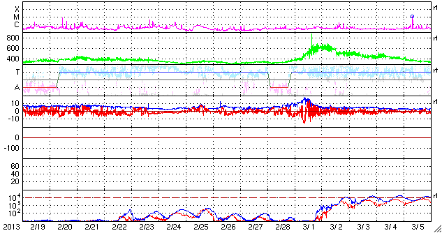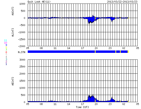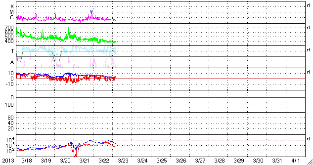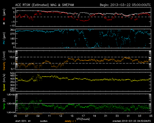 2013/ 3/23 13:53 更新 太陽は穏やかになっています。太陽風は平均的な状態が続いています。 担当 篠原 昨日、太陽の西の端で発生したM1.6の中規模フレアに伴って、 CME(太陽ガスの放出現象)が発生しました。 SOHO衛星LASCO C3による動画を掲載します。 CMEは、地球から見て右方向に噴き出しています。 地球への影響はありません。 1692黒点群では、その後もC1〜2のフレアが何度も発生しましたが、 やがて西に没し、今日の可視光写真では見えなくなっています。 それとともに、太陽は静かになっています。 太陽風は、400km/秒前後と平均的な速度が続いています。 磁場強度は5nTを割って、2nTくらいまで下がりましたが、 現在は再び5nTに戻っています。 AE指数は、太陽風磁場が南を向いた時に500nTの変化が発生して、 その他は静かです。 太陽風が落ち着いているので、今後も同様の変化が見られるでしょう。 鹿児島高専の周辺は、桜は満開直前になっていてとてもきれいです。 午前中は天気も良くて暖かかったのですが、 これから明日にかけて雨になるらしく、ちょっと残念です。