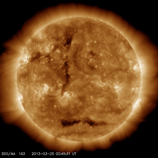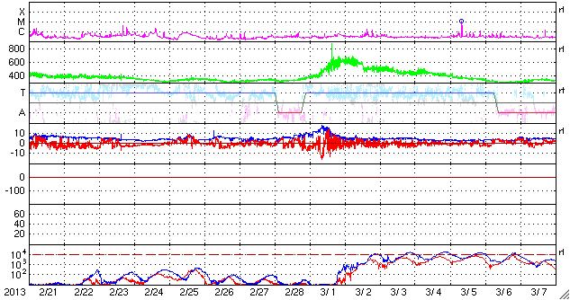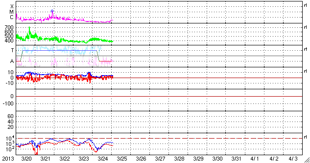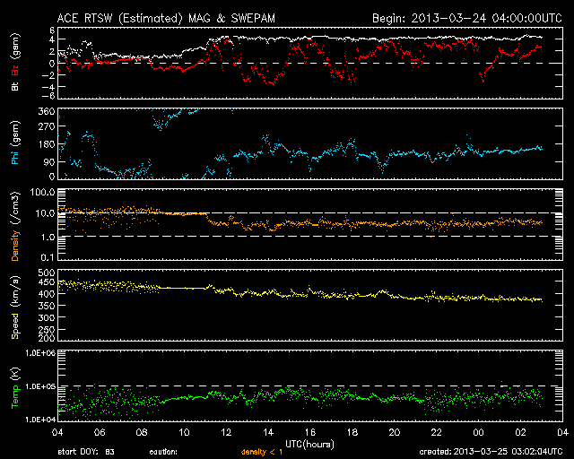 2013/ 3/25 12:02 更新 太陽風はやや低速です。コロナホールが太陽の中心に近づいています。 担当 篠原 昨日440km/秒に上がっていた太陽風の速度は、 その後ゆっくりと下がり、現在は370km/秒とやや低速になっています。 一方、小さくなっていた磁場強度は、その後、4nTと平均的な値に戻り、 以降安定しています。 27日周期の図のセクターのグラフを見ると、 太陽風磁場の大まかな方向が「T」から「A」に切り替わっています。 今回の太陽風磁場強度の弱まりは、 セクターの切り替わりに関係した変化だった様です。 太陽風磁場の南北成分は、 北向きと南向きの間をゆっくりと変化しています。 このため、AE指数を見ると、磁気圏のオーロラ活動も 小規模の変化が数時間おきに発生しています。 SDO衛星AIA193を見ると、太陽の中心の少し左側を、 南北(縦方向)に細長くコロナホールが伸びています。 この領域の影響が、3〜4日後くらいに地球に到来する可能性があります。 27日周期の図を見ると、 前周期の3月1日に600km/秒に達する高速風が到来しています。 27日周期で見積もると、28日頃の到来になりそうです。 太陽は、X線のグラフに目立った変化はなく、穏やかです。 ![]() SDO衛星のAIA193カメラによる太陽コロナの様子 (c) SDO (NASA) ![]() SDO衛星による太陽の可視光写真。マウスの矢印を写真に重ねると、黒点番号付きの写真に切り替わります。 (c) SDO (NASA) ![]() ACEが観測した太陽風の磁場(1番上の枠、白線は全体の強度、赤線は南北成分) および、太陽風の密度(3番目の橙線)、速度(4番目の黄線) (c) NOAA/SWPC ![]() リアルタイムAE指数 下段のAEグラフの値が高くなると、オーロラ活動が活発化しています。 (c) 京都大学, NICT ![]() 27日の太陽周期に合わせたデータプロット 太陽が同じ面を地球に向けていた27日前の変化から、今後を予想することができます。 (c) 作図:宇宙天気ニュース