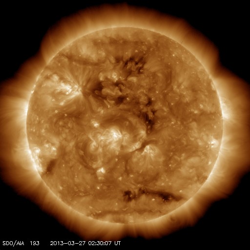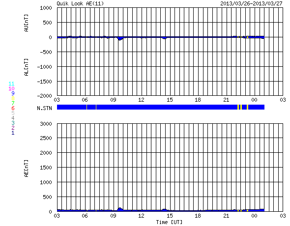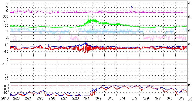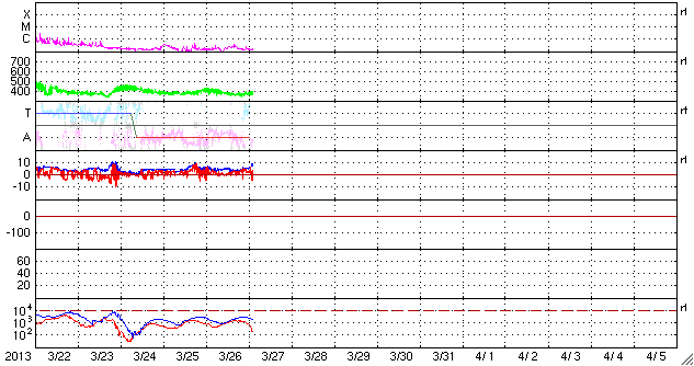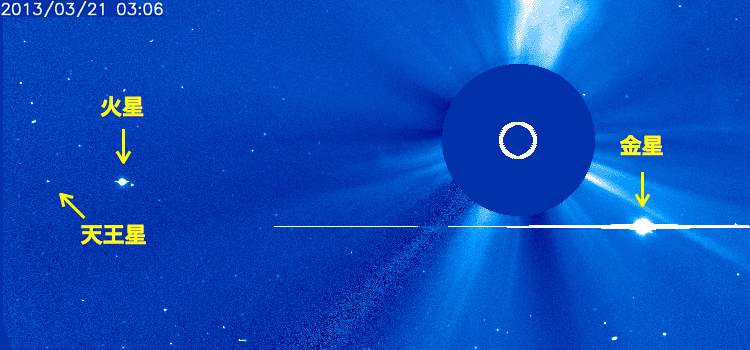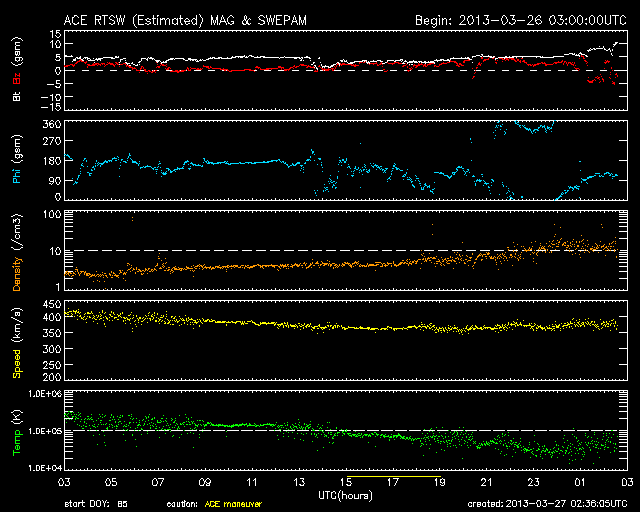 2013/ 3/27 11:37 更新 太陽風はやや低速です。SOHO衛星LASCO C3に天王星、火星、金星が見えています。 担当 篠原 宇宙天気がとても静かなので、違う話ですが・・・ SOHO衛星LASCO C3カメラの写真に、 天王星、火星、金星と3つの惑星が写っています。 この1週間の動きを動画にまとめたのでご覧ください。 太陽の右下で明るく光っているのは金星、 左側で次に明るく光っているのは火星です。 この2つの惑星を見つけるのは簡単ですが、 天王星は、暗いことと背景の恒星とほとんど一緒に動いて見えるため、 見つけるのはやや手強いです。 動画に矢印付きの解説図を加えているので、それを参考に見つけて下さい。 22日から23日にかけて火星を追い抜くのを目印にすると見つけやすいでしょう。 天王星の位置もじっくり見ると背景の恒星と少しずつずれて行きます。 たとえば天王星の左下に暗い星の三角形が見えます。 その三角形との位置関係をじっと見ていると、 天王星は少しだけ左にずれて行くのが分かります。 この後、天王星は太陽の右側に出現します。 SOHO衛星のページで、ぜひ見つけてみて下さい。 太陽風は、速度は370km/秒とやや低速になっています。 磁場強度は、5nT前後で安定していましたが、 ACEの図の最後で10nT近くまで強まっています。 27日周期の図を見ると分かりますが、 これからコロナホールによる太陽風の強まりが到来すると思われます。 現在の磁場強度の強まりは、その回帰としては少し早過ぎるかもしれませんが、 太陽風変化の回帰が1日程度前後することはよくあることなので、 この後の変化に注目してください。 磁気圏活動は穏やかです。 AE指数はほとんど変化していません。 太陽の活動も静かです。 黒点は小さなものが見えるだけで、 X線の強度も全体的に下がったままです。