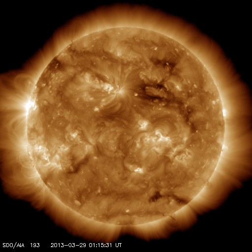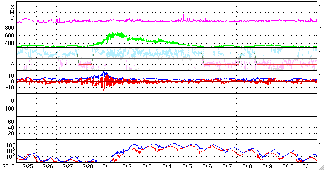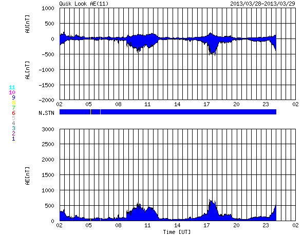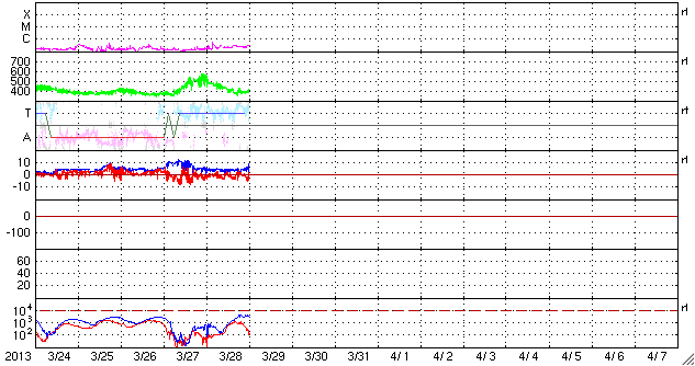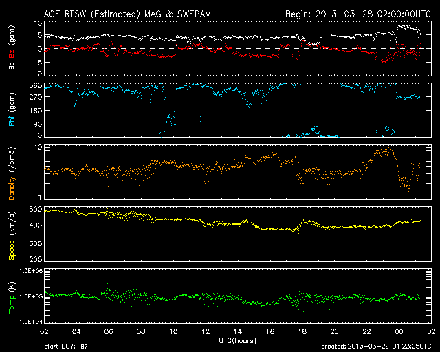 2013/ 3/29 10:24 更新 太陽風は平均的な速度に下がりました。太陽も静穏です。 担当 篠原 昨日のニュース以降、太陽風の速度はゆっくりと下がる様になり、 29日0時(世界時28日15時)頃には、 400km/秒と平均的な状態に戻ってしまいました。 27日周期の図を見ると、今回の高速風は1日ほど続いただけで、 前周期の変化と比べると、継続時間も最高速度も縮小しています。 その一方、SDO衛星AIA193の太陽コロナ写真に見えていた 北半球側のコロナホールは、 地球へ影響が及び始める目安の位置に来ています。 太陽風の変化はこれから第二段がやって来るかもしれません。 この後の変化にも注目してください。 太陽風の磁場強度は、5nTと平均的な状態で安定しています。 南北成分は、比較的南寄りに振れていて、 -2nTと振れ幅は大きくありませんが、南向きの変化が度々起きています。 これに反応して、磁気圏でもAE指数500nT程の中規模のオーロラ活動が 数時間おきに発生しています。 太陽風としては、速度が下がって落ち着いてしまったので、 今後の磁気圏活動は、小中規模の変化が見られる程度でしょう。 放射線帯の高エネルギー電子は、 今のところ特に大きく増加はしていません。 太陽は、特にフレアもなく静穏です。 東から現われた1708黒点群の活動度はどうでしょうか。