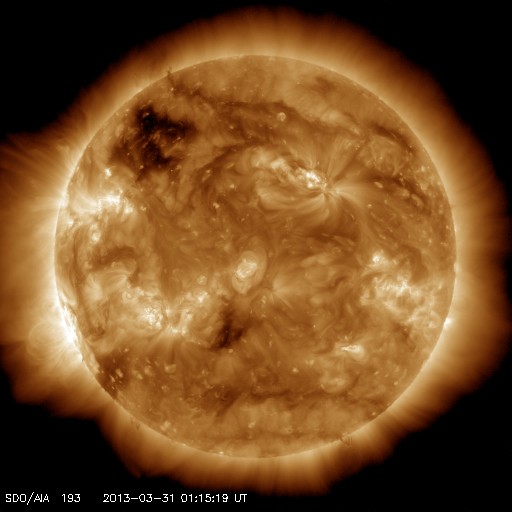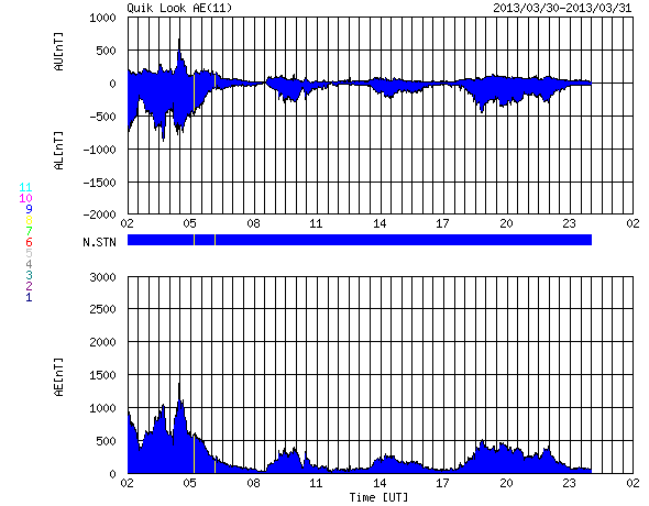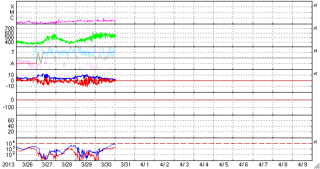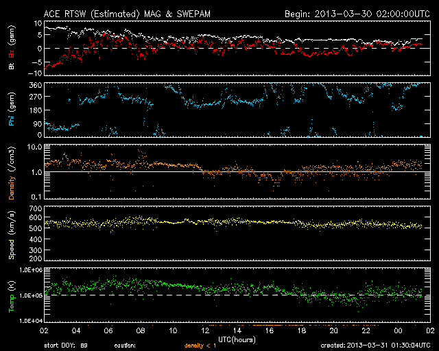 2013/ 3/31 10:30 更新 500km/秒台の高速太陽風が続いています。ムルマンスクのオーロラをどうぞ。 担当 篠原 太陽風は、高速の状態が続いています。 速度としては、昨日の550km/秒が最高速度だったようで、 それ以上特に上がることなく推移して、 現在は520km/秒と少し下がり始めているところです。 磁場強度は、7nTからすぐに5nTを割るくらいに下がり、 現在は、3〜4nTとやや弱めになっています。 このため、高速太陽風の領域は後半に入っていると思われます。 磁場の南北成分は、0nTを挟んで、北に向いたり南に向いたりしています。 強度が下がってきたので、振れ幅は小さくなってしまいましたが、 磁場が南を向いた時に、地球では磁気圏活動の強まりが発生しています。 AE指数のグラフを見ると、小さい時で300nT、 大きいと1000nTの変化が記録されています。 この様な宇宙天気の状況で、ロシアのムルマンスクの福島さんより、 コンスタンチン・レタヴィン氏が31日に撮影した オーロラの写真をいただきました。 まだ寒そうな町並みの上空を、 渦を次々に巻くように輝いているオーロラの姿をご覧ください。 福島さんによると、ムルマンスクでは根雪が溶け始めて、 通りはモフモフした深くて柔らかい雪であふれ、 歩きづらくなっているそうです。 また、除雪車が削り剥がした土混じりの根雪の山が町のあちこちに置かれて、 雪が「瓦礫化」しているそうです。 福島さんは困っている様子ですが、 雪が降ることすら珍しい鹿児島の私には、 想像もできない雪国の春の光景が広がっている様です。 この数日、活気のある磁気圏の状態をグラフで見ているだけでしたので、 オーロラの様子を見せていただけると、すごく現実味を感じます。 白夜の日々が近付いている中の、貴重なオーロラ写真とのことです。 どうもありがとうございました。 SDO衛星AIA193では、コロナホールは西に遠ざかりつつあります。 高速風は、これから次第に速度を下げて、 明日くらいに通常の太陽風に戻るのではないでしょうか。 放射線帯の高エネルギー電子が増加して、 青線のGOES15は10,000のレベルに達しそうです。 太陽は、南東の端(左下)から1711黒点群が顔を出しました。 X線グラフに目立った変化はなく、穏やかな状態が続いています。 ![]() 31日にロシアのムルマンスクで、コンスタンチン・レタヴィン氏により撮影されたオーロラ。 (c) 福島留美氏、コンスタンチン・レタヴィン氏 ![]() SDO衛星のAIA193カメラによる太陽コロナの様子 (c) SDO (NASA) ![]() SDO衛星による太陽の可視光写真。マウスの矢印を写真に重ねると、黒点番号付きの写真に切り替わります。 (c) SDO (NASA) ![]() ACEが観測した太陽風の磁場(1番上の枠、白線は全体の強度、赤線は南北成分) および、太陽風の密度(3番目の橙線)、速度(4番目の黄線) (c) NOAA/SWPC ![]() リアルタイムAE指数 下段のAEグラフの値が高くなると、オーロラ活動が活発化しています。 (c) 京都大学, NICT ![]() 27日の太陽周期に合わせたデータプロット 太陽が同じ面を地球に向けていた27日前の変化から、今後を予想することができます。 (c) 作図:宇宙天気ニュース