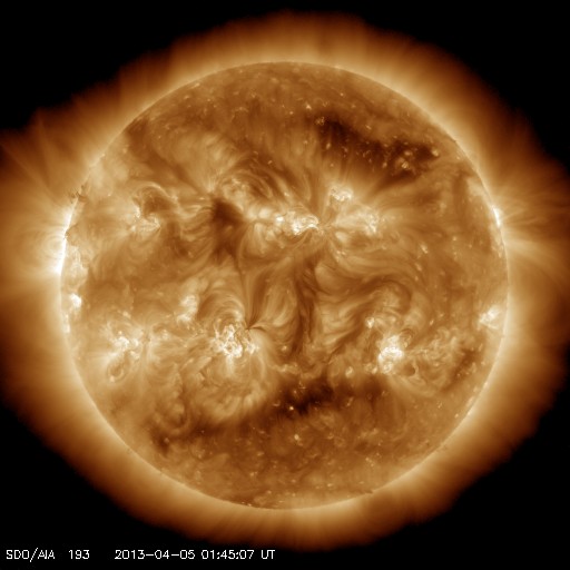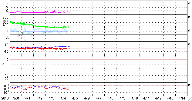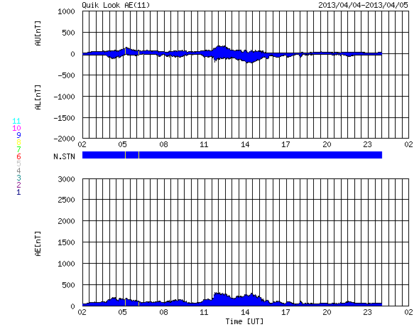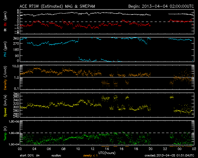 2013/ 4/ 5 10:52 更新 太陽風は280km/秒と低速の状態が続いています。太陽も穏やかです。 担当 篠原 とても速度の遅い太陽風が続いています。 昨日のニュースの後、320km/秒へ少しだけ上がったのですが、 その後また低下して、現在は280km/秒と再び300km/秒を割っています。 磁場強度は、5nTと平均的な値になっています。 南北成分は、南を向いている時間が長く、 振れ幅も-3nTを前後する程度に強まっています。 このため、AE指数では200〜300nTくらいの 小規模の変化が観測されています。 速度が遅いこともあり、変化の規模は小さい様ですが、 昨夜のアラスカのライブカメラでは、 なかなかきれいなオーロラを見ることができました。 27日周期の図の前周期(3月9日以降)にあるように、 かなり低速の太陽風はこのまましばらく続きそうです。 太陽は、中央の1713黒点群の黒点が増加しています。 C1.2の小規模フレアも起こしていますが、 太陽全体としては穏やかな状態です。 ![]() SDO衛星のAIA193カメラによる太陽コロナの様子 (c) SDO (NASA) ![]() SDO衛星による太陽の可視光写真。マウスの矢印を写真に重ねると、黒点番号付きの写真に切り替わります。 (c) SDO (NASA) ![]() ACEが観測した太陽風の磁場(1番上の枠、白線は全体の強度、赤線は南北成分) および、太陽風の密度(3番目の橙線)、速度(4番目の黄線) (c) NOAA/SWPC ![]() リアルタイムAE指数 下段のAEグラフの値が高くなると、オーロラ活動が活発化しています。 (c) 京都大学, NICT ![]() 27日の太陽周期に合わせたデータプロット 太陽が同じ面を地球に向けていた27日前の変化から、今後を予想することができます。 (c) 作図:宇宙天気ニュース