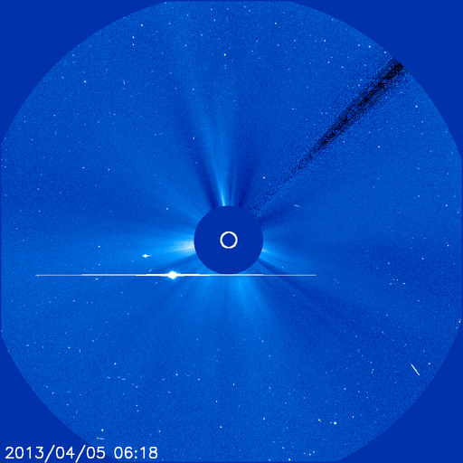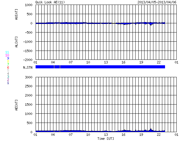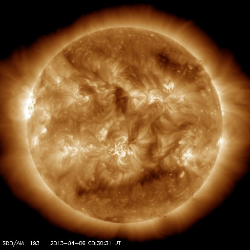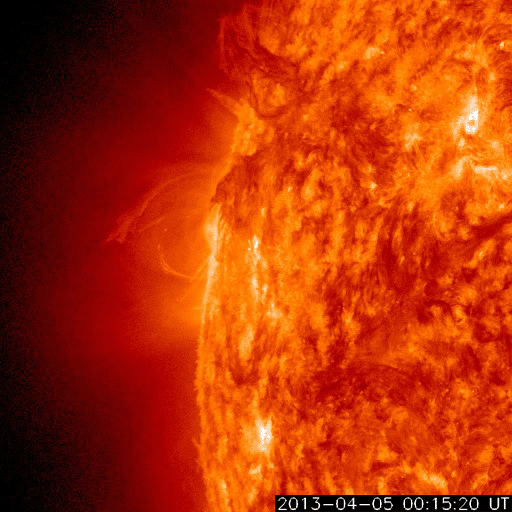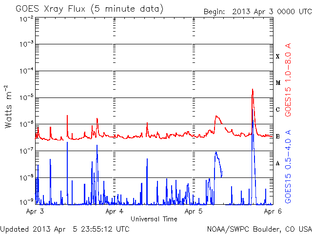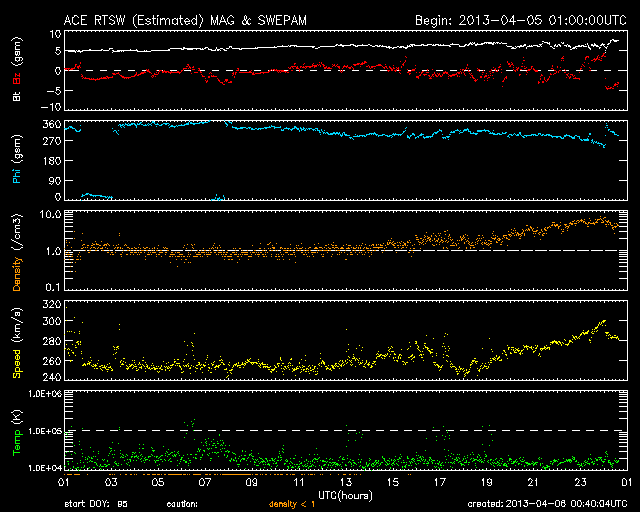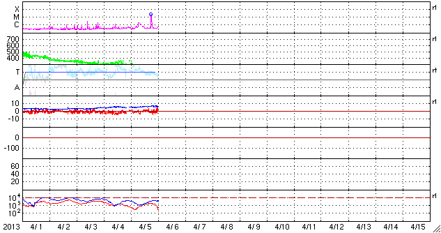 2013/ 4/ 6 09:40 更新 太陽の東端から活動的な領域が現われ、M2の中規模フレアが発生しました。 担当 篠原 太陽の東端から、活動的な領域が現われました。 昨日、5日15時(世界時5日6時)に、C2.1の小規模のフレアが発生し、 続いて、6日1時半(世界時5日17時半)に、 M2.2の中規模フレアが発生しました。 活動の様子を、SDO衛星AIA304の動画で紹介します。 C2.1フレアは、まだ太陽の裏側だったのか、 発生後と思われるループ状のプロミネンスの輝きだけが見えています。 続いて、M2.2による激しい輝きが発生します。 C2.1フレアはX線の変化が長時間続くタイプで、 その後、CMEの噴出がSOHO衛星LASCO C3カメラで観測されています。 地球からは横方向に噴き出しているので、影響はないでしょう。 太陽の可視光写真では、新しい黒点も見えています。 1719黒点群と番号が付けられました。 この黒点群の今後の活動に注目してください。 太陽風は、300km/秒を割ったかなり低速の状態が続いています。 昨日のニュースの後、速度は250km/秒まで下がりました。 その後、280km/秒に少し上がっていますが、 この遅い太陽風は、まだ続きそうです。 磁場強度は、5〜6nTと平均的な状態で安定しています。 AE指数はほとんど変化がなく、磁気圏は静穏です。