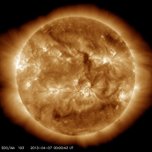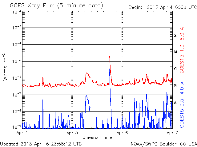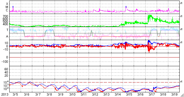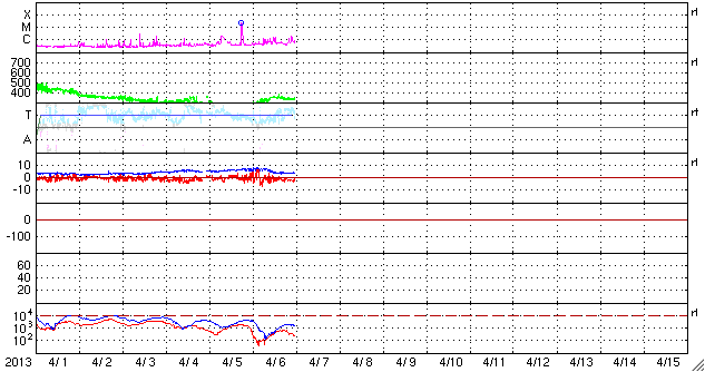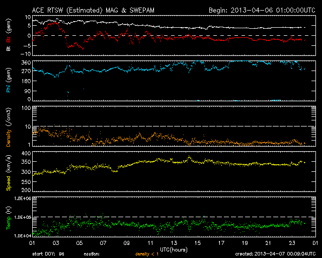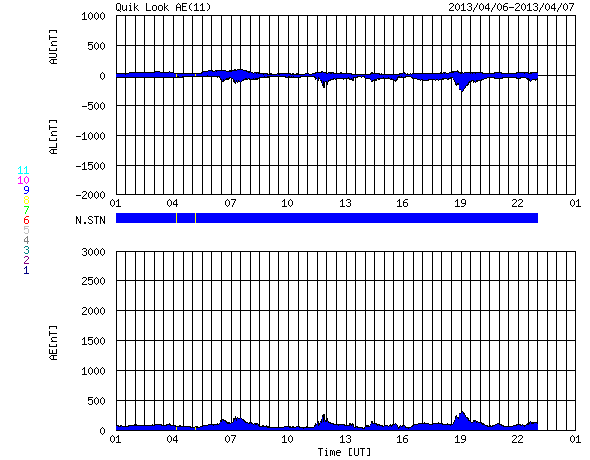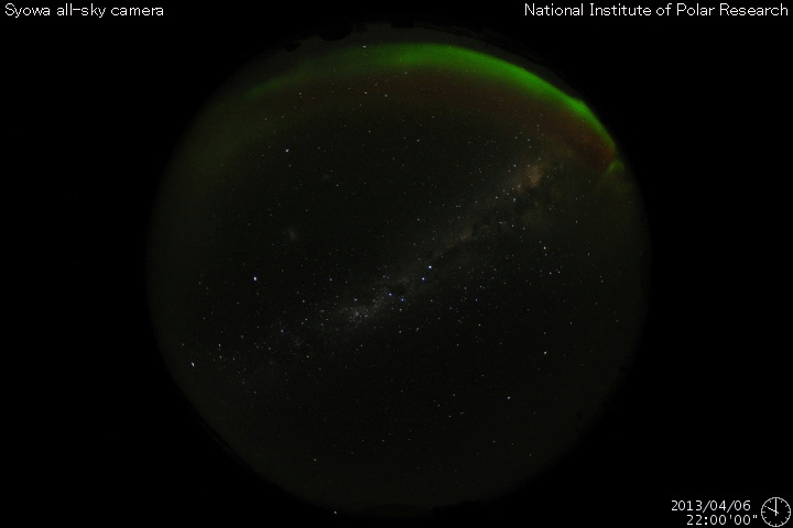 2013/ 4/ 7 09:10 更新 太陽風は低速の風が続いています。Cクラスフレアが続いています。 担当 篠原 南極の昭和基地の全天カメラで撮影されたオーロラの動画を掲載します。 月の無い暗い空の中で、天の川との共演です。 昭和基地の全天カメラは、10秒間隔で写真が公開されているので、 オーロラの動きをより滑らかに見ることができます。 太陽風の速度は、 昨日のニュースの後に半日ほどかけて350km/秒へ少し上がりました。 磁場強度は、速度が上がる頃に7nTに少し高まって、 現在は4nTに戻っています。 太陽風の変化は小さなもので、低速である状況は変わっていません。 27日周期の図を見ると、変化の大まかな様子を見ることができます。 穏やかな太陽風はこのまま続きそうです。 AE指数は小さな変化がいくつか見えています。 太陽風磁場の南北成分が比較的南寄りに振れているためでしょう。 最初に紹介した昭和基地のオーロラの動画もこの変化の一部です。 太陽は、北東の1718黒点群などで、C1のフレアが7回発生しています。 全体の活動度が少し上がっているようで、 この後もフレアが続く可能性があります。