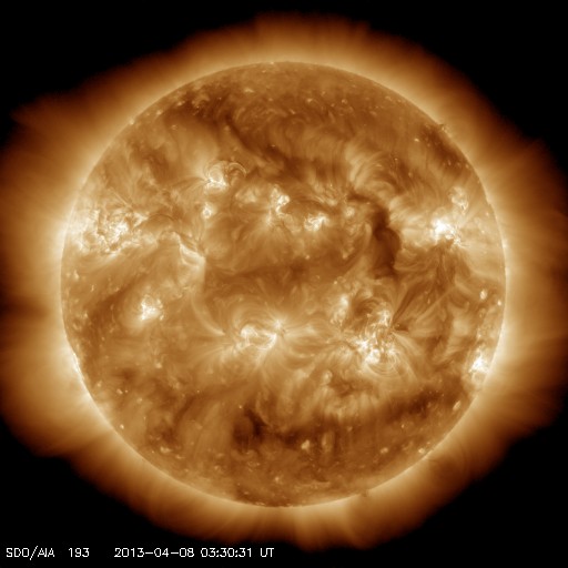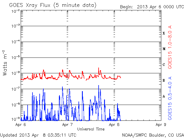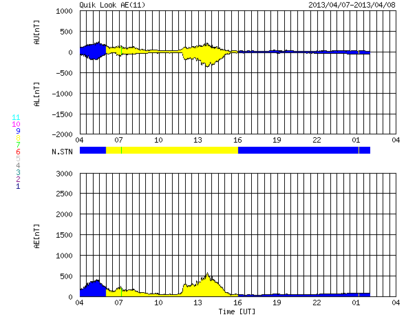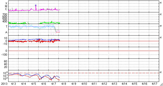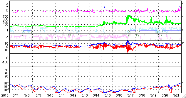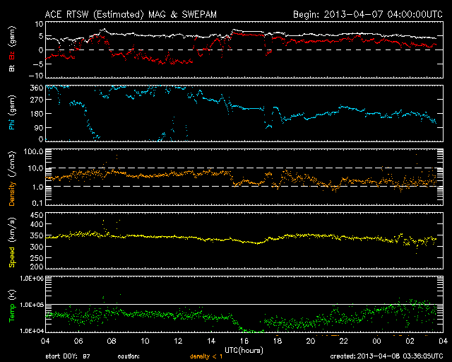 2013/ 4/ 8 12:36 更新 太陽風は低速風が続いています。カナダで撮影されたオーロラとパンスターズ彗星をどうぞ。 担当 篠原 カナダの谷角 靖さんより、3月末に北極海で撮影された、 オーロラとパンスターズ彗星と、たくさんの星たちの写真を頂きました。 若干の薄暮の残る(でしょうか?)空に、 複雑な形をしたオーロラが輝いています。 これだけでも素晴らしい写真なのですが、よく見ると、 右端の下の方、明るく輝いているオーロラの右下に パンスターズ彗星が写っています。 少しぼやけた星から左上に淡く尾が伸びています。 その左上のオーロラのすぐ近くには、 アンドロメダ大星雲が小さくぼんやりと写っています。 (星雲が上、彗星が下です) 彗星から左に目を動かして、 オーロラをちょうど通り抜けたところに、 プレアデス星団(すばる)が小さな星の集まりとして見え、 そのもう少し左に明るく輝いているのは木星です。 贅沢としかいいようのない素晴らしい夜景です。 谷角さんによると、現在は23時でも空は薄明るくて、 オーロラが見られるのもあと2週間程度だとのことです。 きれいな写真を、どうもありがとうございます。 パンスターズ彗星とアンドロメダ大星雲の大接近については、 Spaceweather.comでこんな写真も公開されています。 言葉を失う様な光景です。 太陽風は、350km/秒から330km/秒と低速の状態で安定しています。 磁場強度も5nTと平均的な値です。 磁場の南北成分は、グラフの前半は南寄り(マイナス寄り)、 後半は北寄り(プラス寄り)になっています。 磁気圏もこれに反応して、AE指数は前半に小中規模の変動が、 後半は静かになっています。 27日周期の図を参考にすると、まだ3日程度は低速の太陽風が続きそうです。 太陽は、C1〜3の小規模フレアが4回ほど、 太陽のあちこちで発生しています。 特に活発な領域はありませんが、 X線の動画を見ているとある程度にぎやかです。