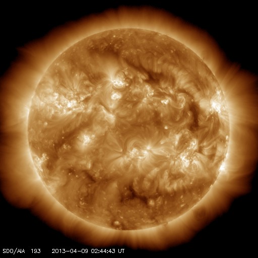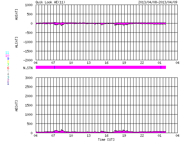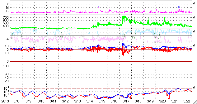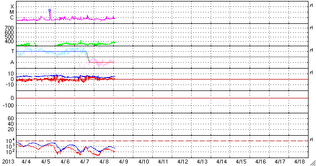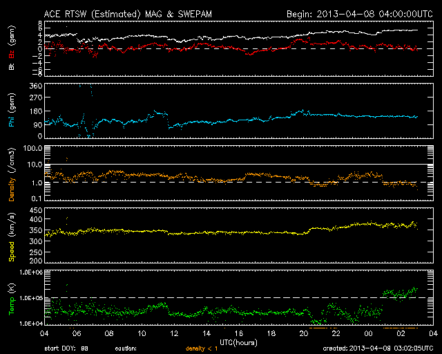 2013/ 4/ 9 12:03 更新 低速の太陽風が続いています。太陽ではC1〜2のフレアが発生しています。 担当 篠原 太陽風の速度は、350km/秒付近で安定しています。 磁場強度も、4〜5nTでほとんど変化なく、 穏やかな太陽風が続いています。 磁場の南北成分は、0nTから北寄りで変化しており、 磁気圏も静穏です。 AE指数のグラフは小さな変化が見られる程度です。 27日周期の図を見ると、 前周期は3月14日まで速度の遅い太陽風が続き、 15日以降450km/秒程度とやや高速の風に変わっています。 (17日の大きな上昇は、CMEによる突発性の変化です) この変化を参考にすると、太陽風は今日、明日くらいまで低速の状態が続き、 その後、速度が一段上がる可能性があります。 磁場強度の強まりから始まりそうなので、ACEの変化に注目してください。 太陽は、東端の1713黒点群、中央の1718黒点群がやや発達しています。 そして、1713群や1714群でC1〜2の小規模フレアが3回発生しています。 現状程度の活動がしばらく続きそうです。 ![]() SDO衛星のAIA193カメラによる太陽コロナの様子 (c) SDO (NASA) ![]() SDO衛星による太陽の可視光写真。マウスの矢印を写真に重ねると、黒点番号付きの写真に切り替わります。 (c) SDO (NASA) ![]() ACEが観測した太陽風の磁場(1番上の枠、白線は全体の強度、赤線は南北成分) および、太陽風の密度(3番目の橙線)、速度(4番目の黄線) (c) NOAA/SWPC ![]() リアルタイムAE指数 下段のAEグラフの値が高くなると、オーロラ活動が活発化しています。 (c) 京都大学, NICT ![]() 27日の太陽周期に合わせたデータプロット 太陽が同じ面を地球に向けていた27日前の変化から、今後を予想することができます。 (c) 作図:宇宙天気ニュース