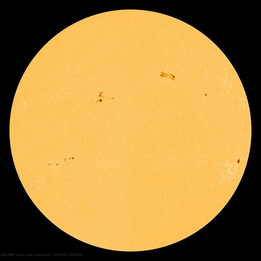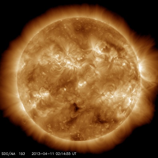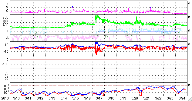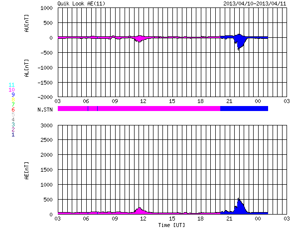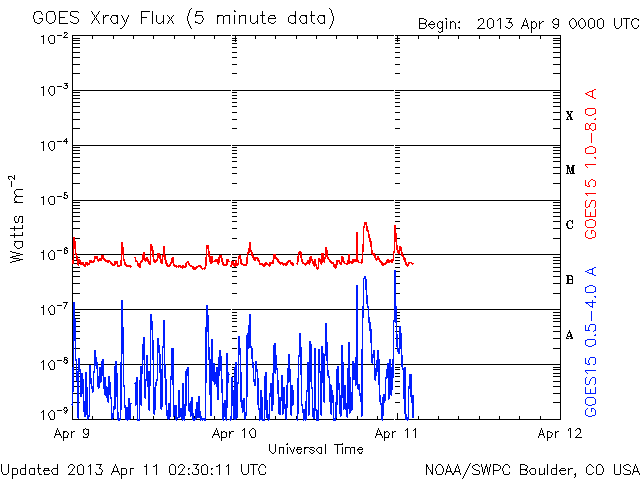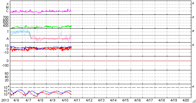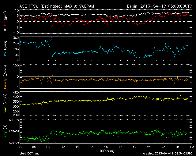 2013/ 4/11 11:32 更新 C3〜4の小規模フレアが3回発生しています。太陽風はやや低速で穏やかです。 担当 篠原 太陽の西に沈んで行った1713黒点群で、 C4.2、C3.9と2つの少し大きなCクラスフレアが発生しています。 1713群の活動度が高まった様ですが、 黒点群は既に地球から見えなくなっています。 中央の1718黒点群でもC3.4が発生し、 その他にC1フレアが数回発生するなど、 太陽は小規模のフレア活動が続いています。 南東部(左下)には、1721、1722黒点群が発生して、 太陽面のにぎやかな状況も続いています。 太陽風は、昨日の350km/秒から、 現在は380km/秒と速度が少しだけ上がっています。 磁場強度も、5nTから7nTへ少しだけ上がっています。 この変化が更に続いて、前周期の様に太陽風の強まりが到来するのか、 今回はこのまま穏やかな風が続くのか、 これからのACEの太陽風データに注目してください。 磁気圏は概ね静穏で、太陽風磁場の一時的な南向き変化に対応して、 AE指数に小規模の変化が発生している程度です。
