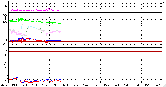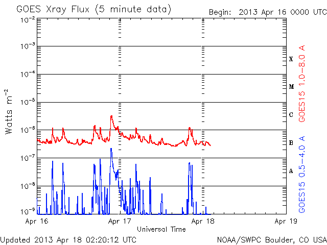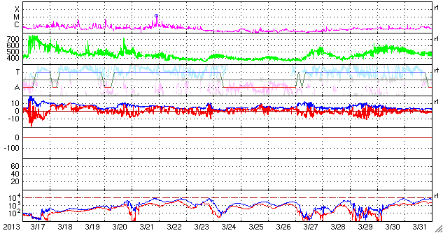 - 2013/ 4/17 12:19 C3.5の小規模フレアが発生しました。太陽風は低速で、磁気圏も概ね静穏です。